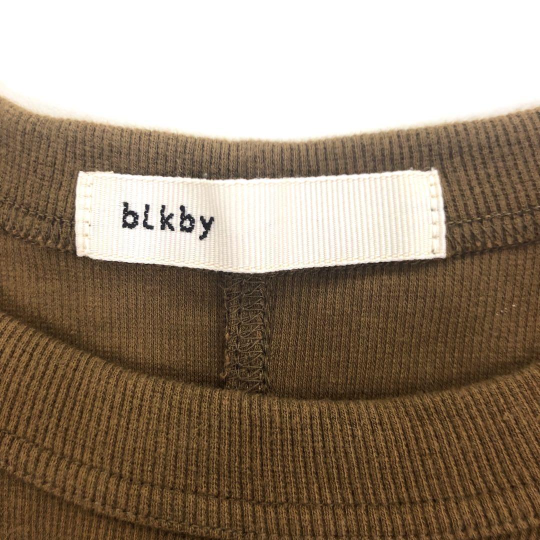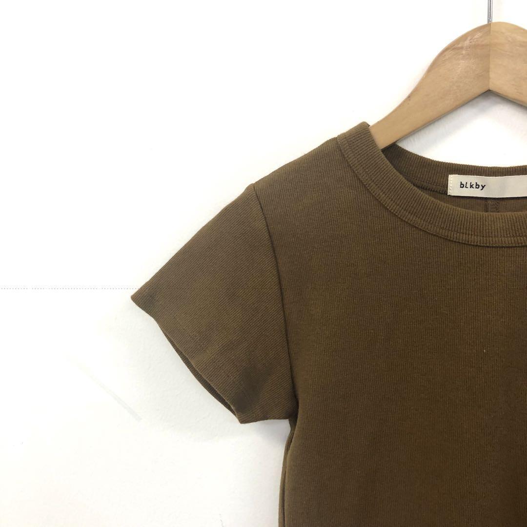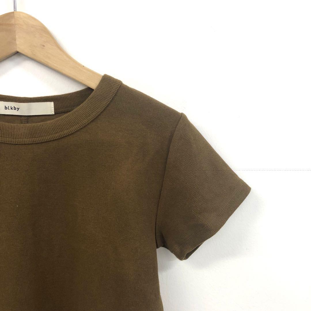 blkby 半袖Tシャツ カーキ スリット シンプル Uネック 大人カジュアル マスタード色 リブデザイン 裾ラウンド