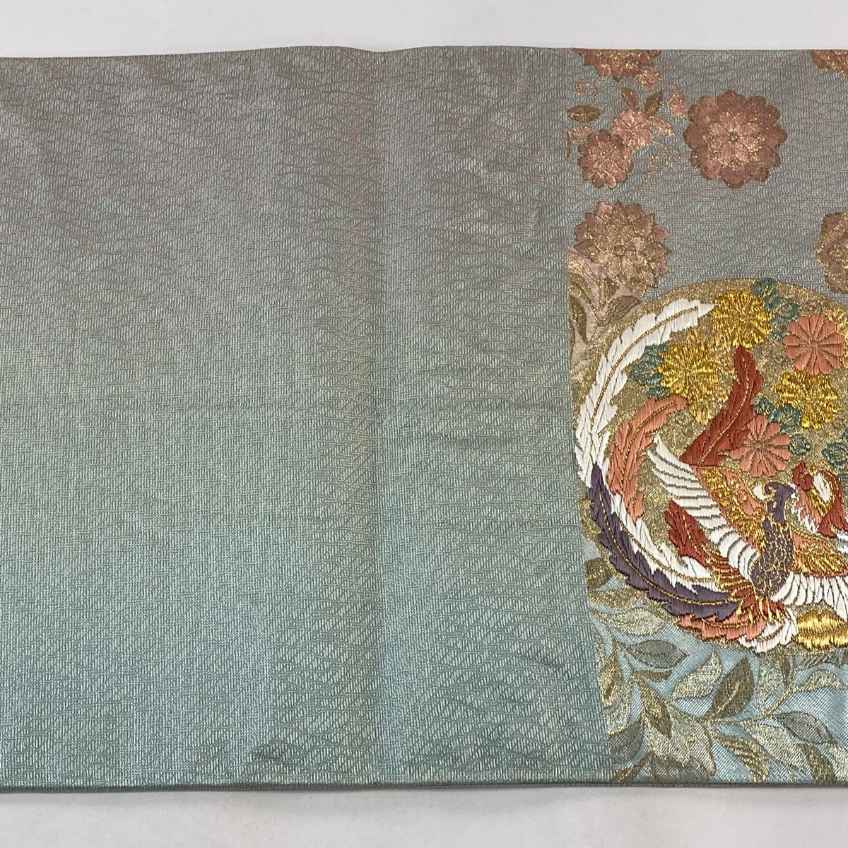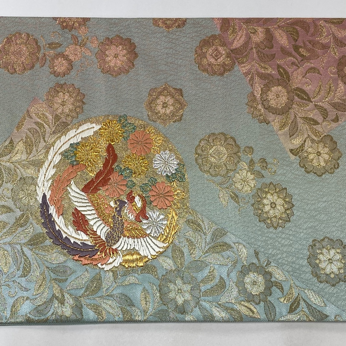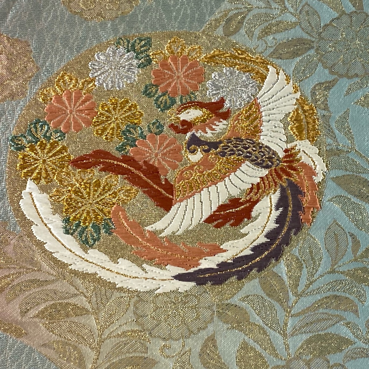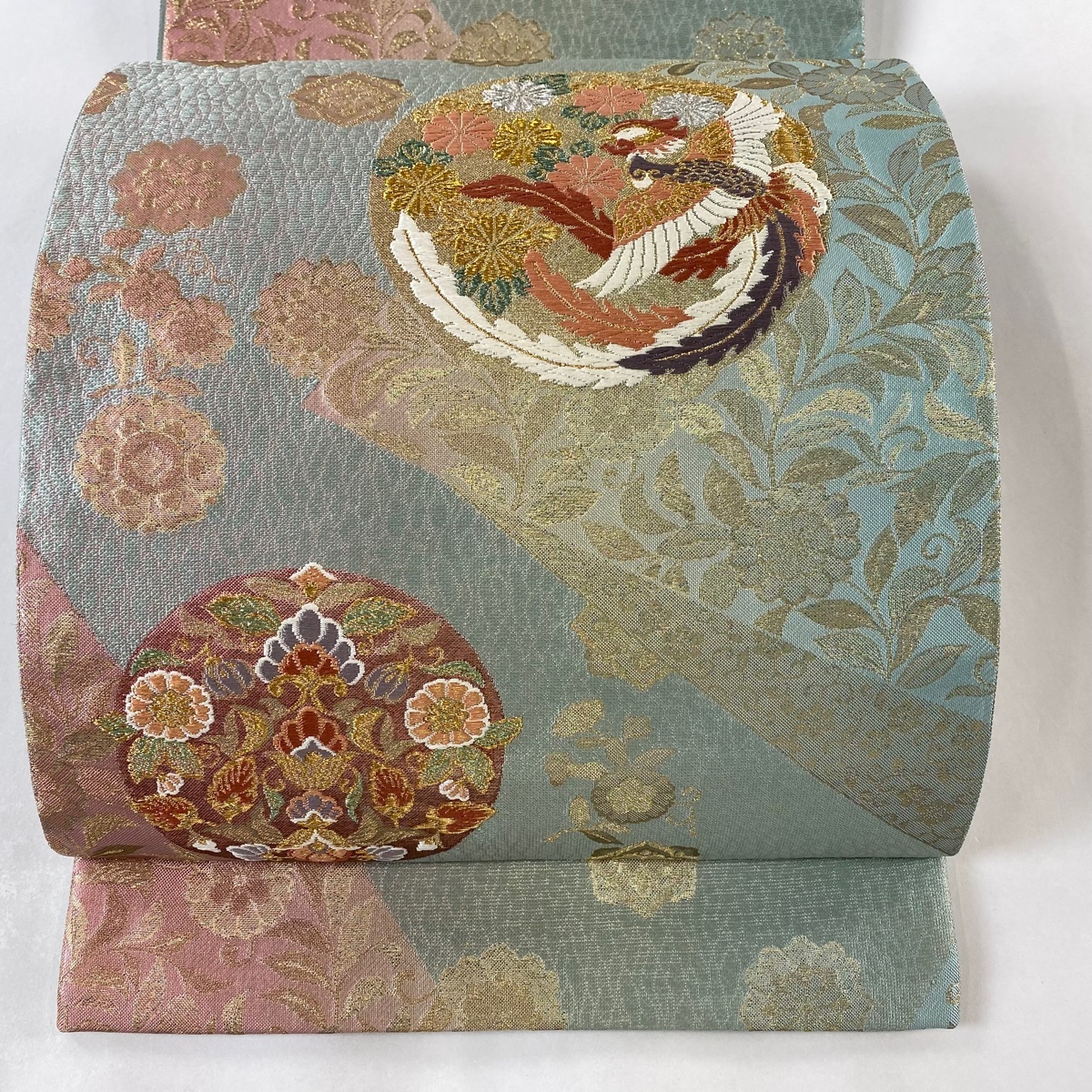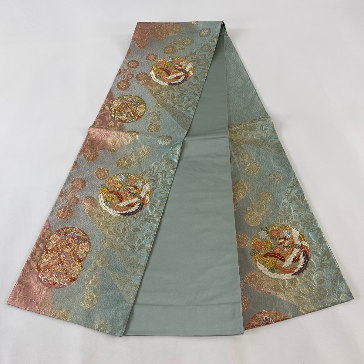 | 袋帯 美品 秀品 丸文 鳳凰 箔 金銀糸 薄緑 六通 正絹 【中古】 |