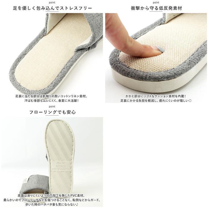 商品説明 | ・・サラッと快適!履き心地の良い、ルームシューズが新登場。 ・【足を優しく包み込んでストレスフリー】 ・足裏に当たる部分は肌触りの良いコットンリネン素材。汗ばむ季節もムレにくく、春夏に大活躍! ・【衝撃から守る低反発素材】 ・かかと部分にソフトなクッション素材を内蔵!足裏にかかる負担を軽減し、疲れにくいのが嬉しい◎ ・【フローリングでも安心】 ・底面は滑りにくいよう凹凸加工を施したPVC素材。柔らかいのでフローリングなどを傷つけることなく、転倒などからガード。歩いた時のパタパタ音も気にならない♪ ・【選べるカラー&サイズ】 ・シンプルでナチュラル感のあるカラーリング&無駄な装飾を省き、誰も着用しやすいデザイン。夫婦や家族お揃いで使えるサイズ展開!(※カラーによりサイズ展開が異なります。) |
