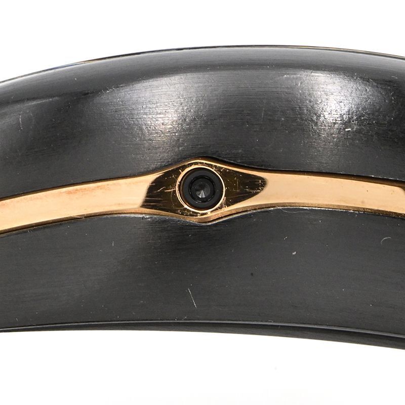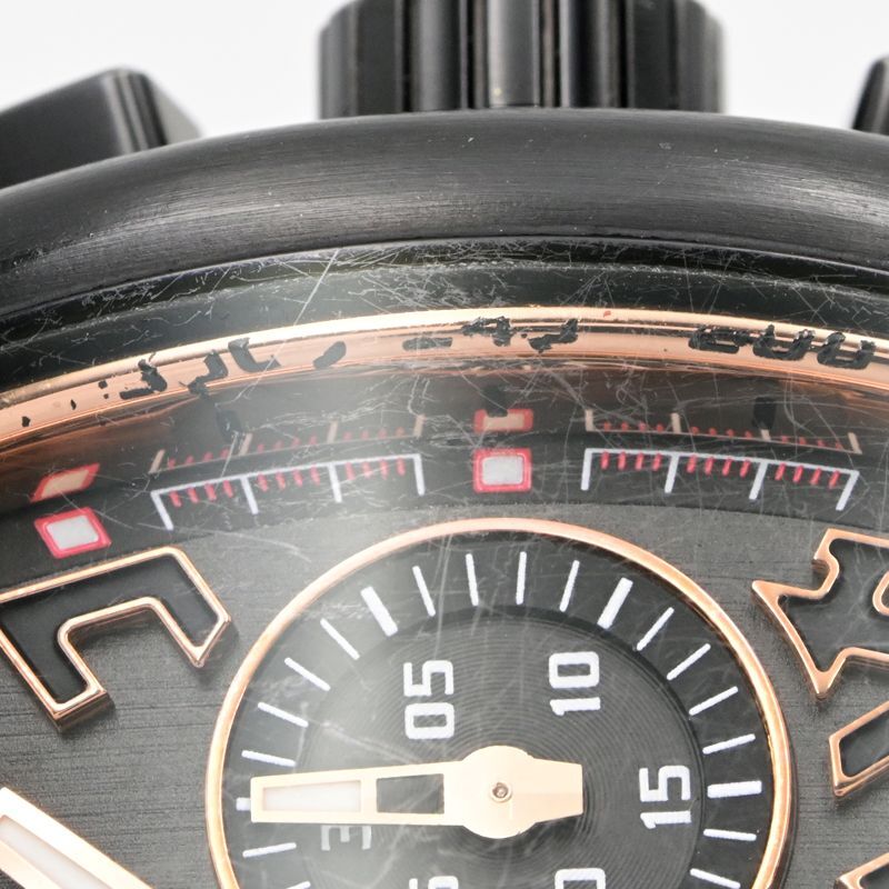 ガラスに極微細なキズ、外周のゴールド部分のメモリに剥がれ、ベゼルとケースサイドとリューズとバックルに微細なスレキズ、ケースサイドのゴールド部分に微細な変色、裏蓋に極微細なスレと極微細な点キズと刻印にコーティングの剥がれが、ストラップに少し使用感と香水のにおいがございます。