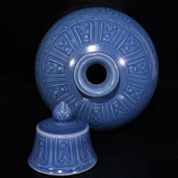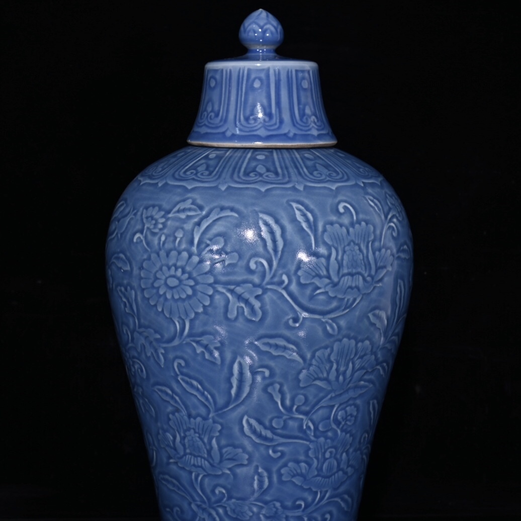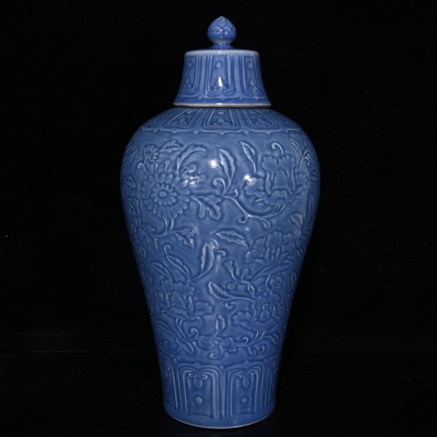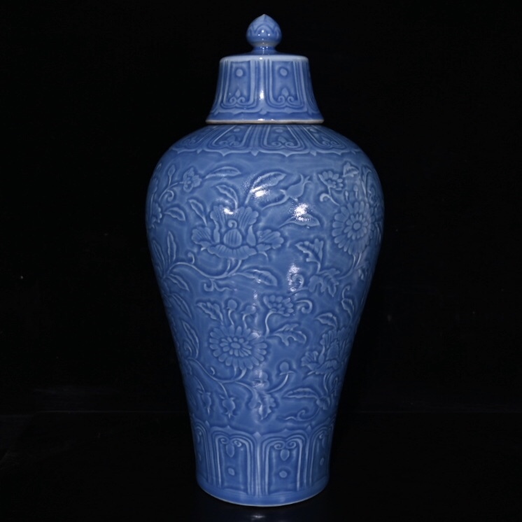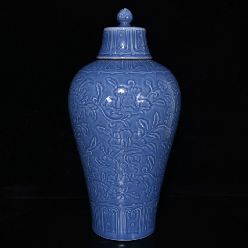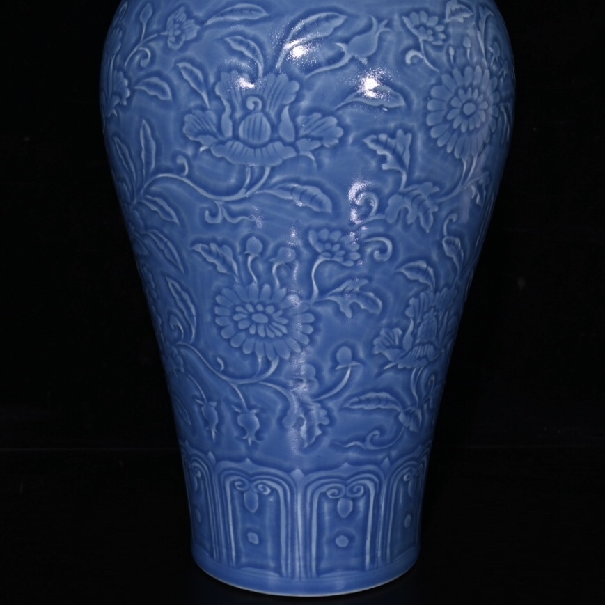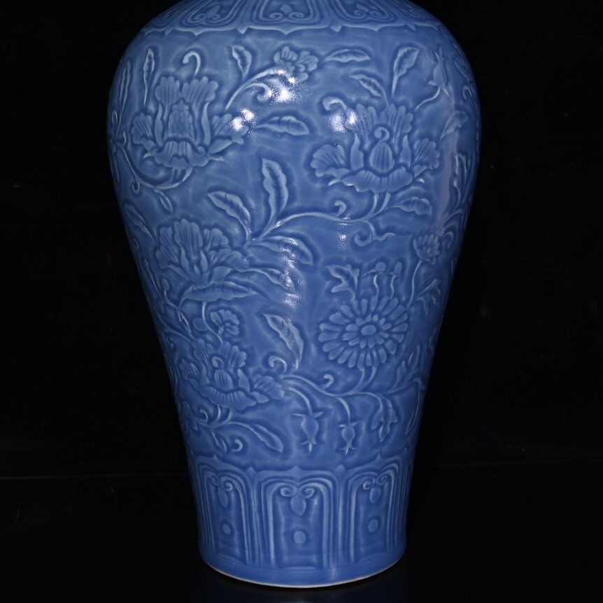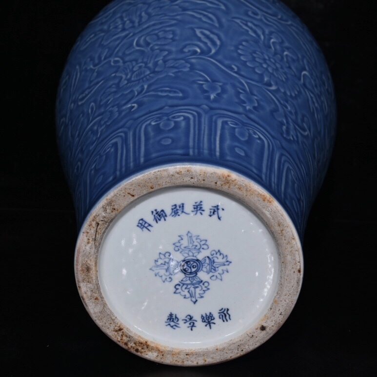 磁器 花瓶 秘藏 明代 永楽年制 武英殿天藍釉彫刻牡丹梅瓶 酒器 茶器 唐磁 染付 陶磁器 收蔵品 古美味 時代物 古美術 古置物中國文玩