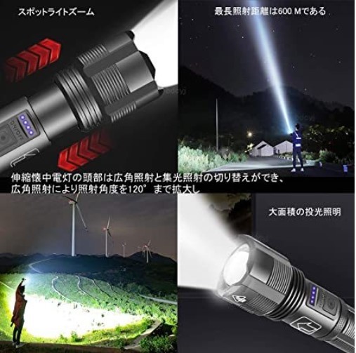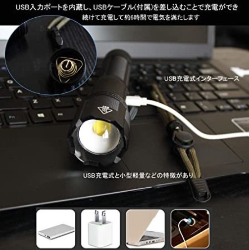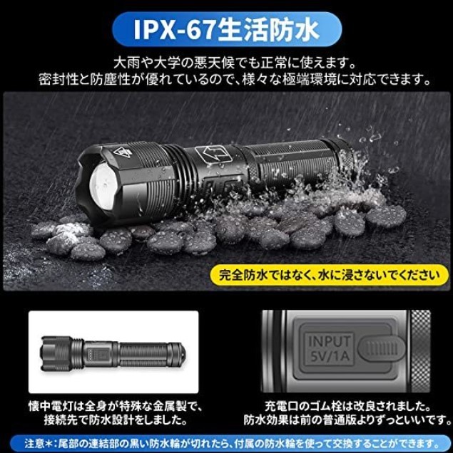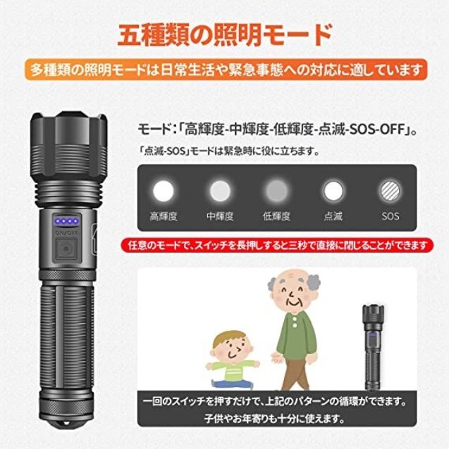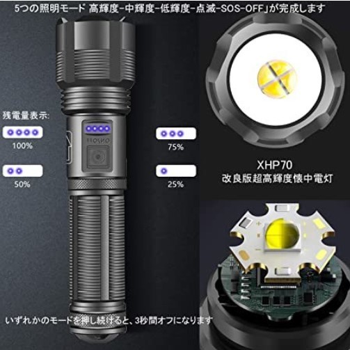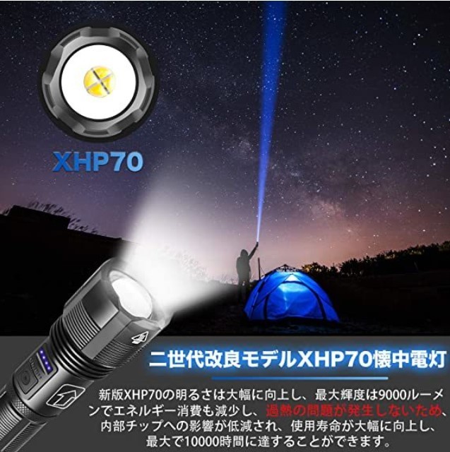 米国で最新開発された二代目改良版CREE XHP70、もう過熱の問題が発生しません。過熱がなくなるため、内部チップの寿命が延び、輝度も大幅に向上する、最大輝度は9000ルーメンに達し、使用時間は10000時間に延長される。5つの照明モードに合わせて、伸縮式ズーム、残電量表示、USB充電式と小型軽量などの特徴があり、日常生活や緊急状況に対応でき、携帯にも便利です。