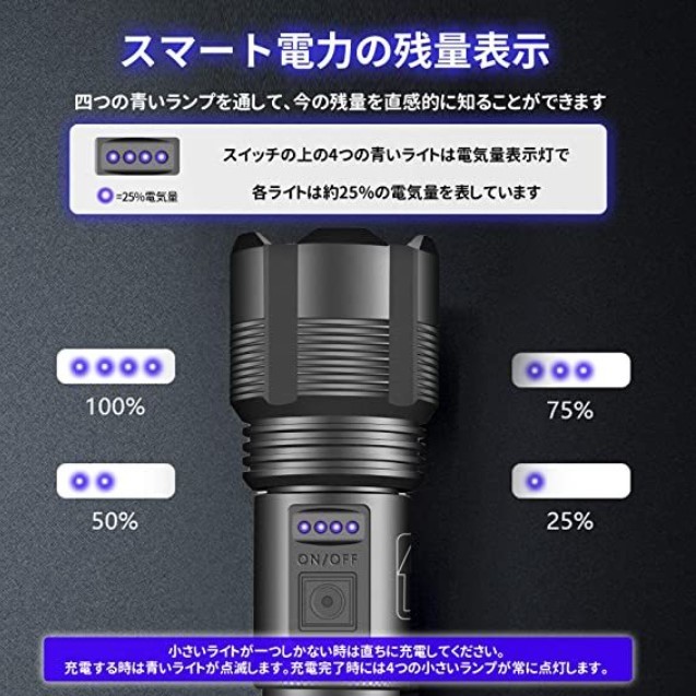 改良後のXHP70は過熱を解消するだけでなく、チップの耐久性を向上させ、使用寿命を大幅に延長し、オーダーメイドのランプビーズ内部反射膜と凸面鏡を採用して、輝度を9000ルーメンに向上させました。バッテリーが尽きた時は電池を交換する必要がなく、付属のUSB高速充電ケーブルを使って懐中電灯に急速に充電できます、続けて充電して約6時間で電気を満たします。「スイッチの上の4つの青いランプは電気のランプで、それぞれのランプは約25%の電気量を表しています。」
