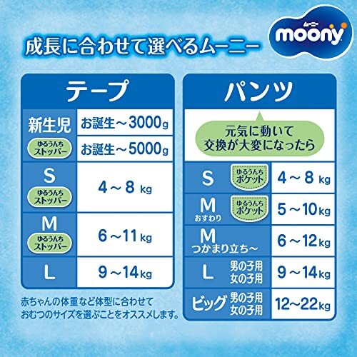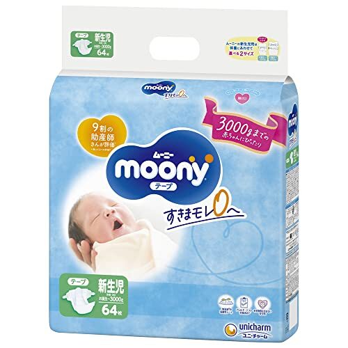 「【テープ 小さめ新生児サイズ】ムーニー オムツ (3000gまで)64枚」▼4903111210947▼(商品説明)テープ 64枚・ 新生児サイズ (64枚) ・・Size:新生児サイズ (64枚)・タイプ : テープ・サイズ(目安の体重) : 新生児 (お誕生~3kg)・商品サイズ (幅×奥行×高さ) : 292×107×276mm・内容量 : 64枚・原産国 : 日本説明 商品紹介 ●ふんわりぴたりでモレ安心 3000gまでの赤ちゃんにもま~るくフィット 64枚入りの大入り数パックです。・使用上の注意 汚れた紙おむつは早くとりかえてください。テープは直接お肌につけないでください。誤って口に入れたり、のどにつまらせることのないよう、保管場所に注意し、使用後はすぐに処理してください。