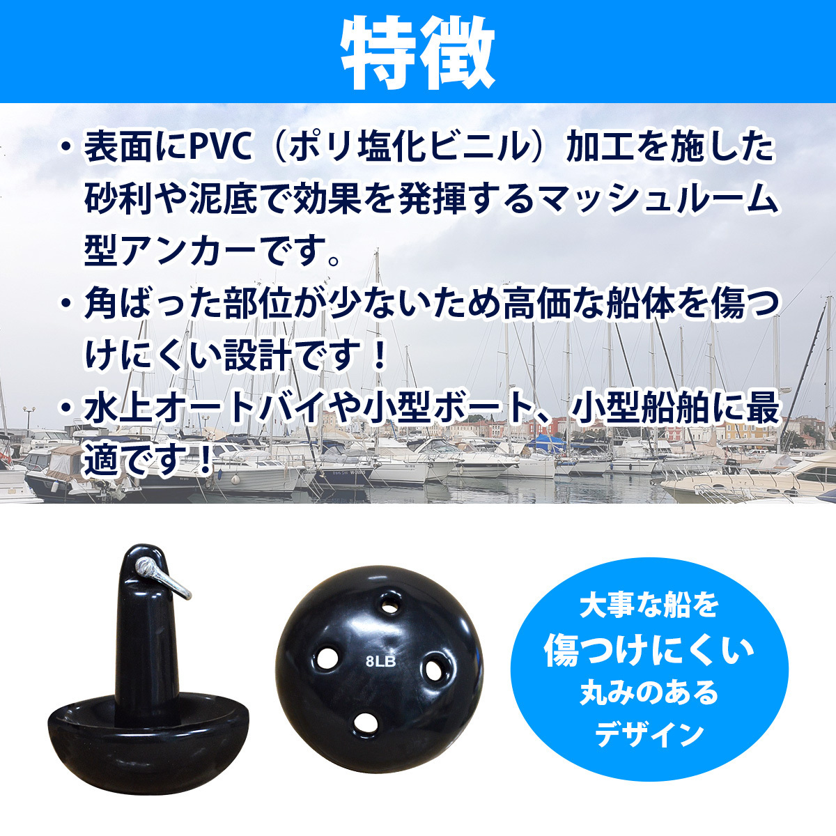角ばった部位が少ないタイプのマッシュルーム型なので、船体に傷をつけにくい設計です!