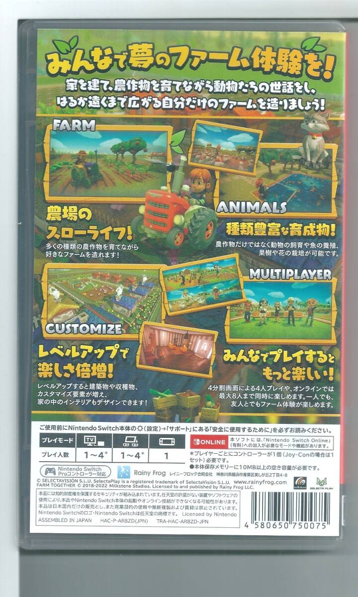 | ●JANコード4580650750075 t2 ☆Switch ファーム トゥギャザー ●商品の状態 ソフトに使用感、ケースに強いスレ・イタミがあります。説明書ははじめから付属していません。 |