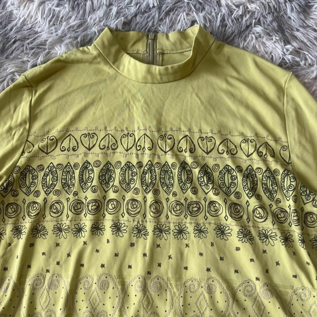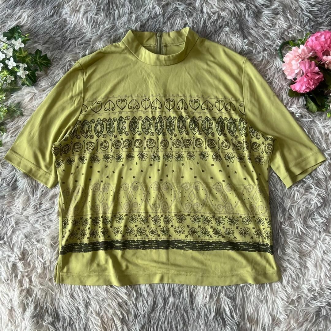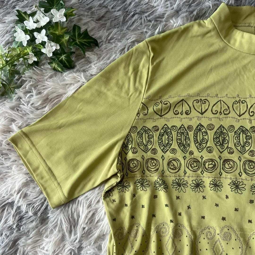 落ち着いたイエローグリーン(黄緑)の生地に、個性的な総柄が特徴です。和柄のようにも見える、繊細なパターンが魅力の一枚です。