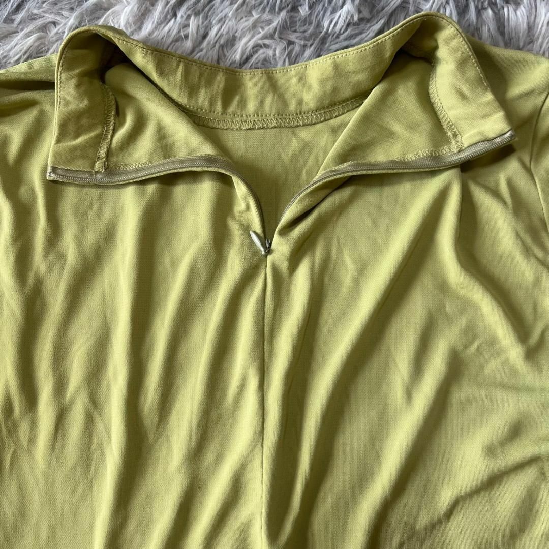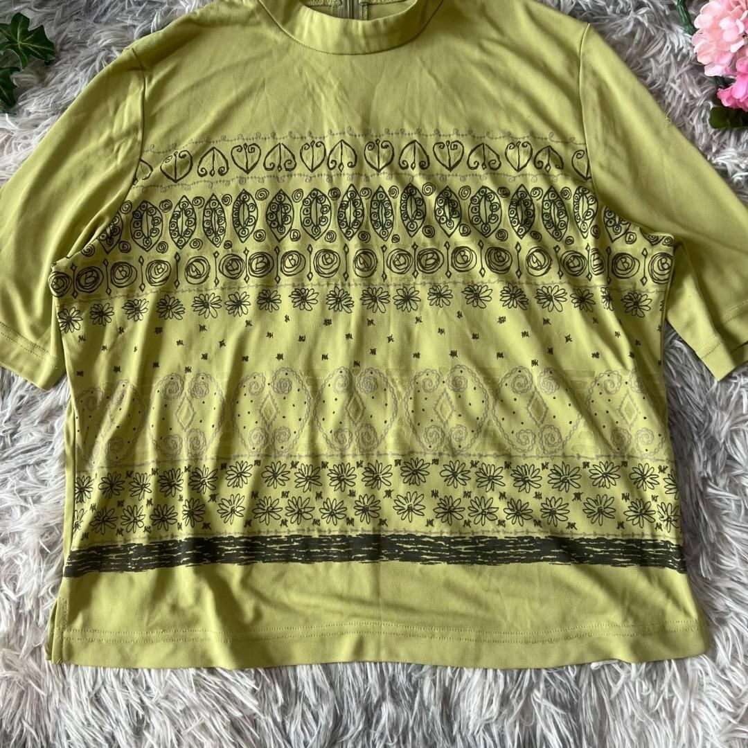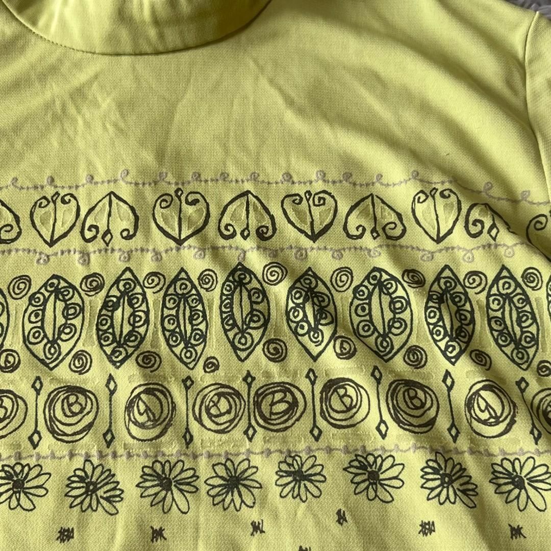 落ち着いたイエローグリーン(黄緑)の生地に、個性的な総柄が特徴です。和柄のようにも見える、繊細なパターンが魅力の一枚です。
