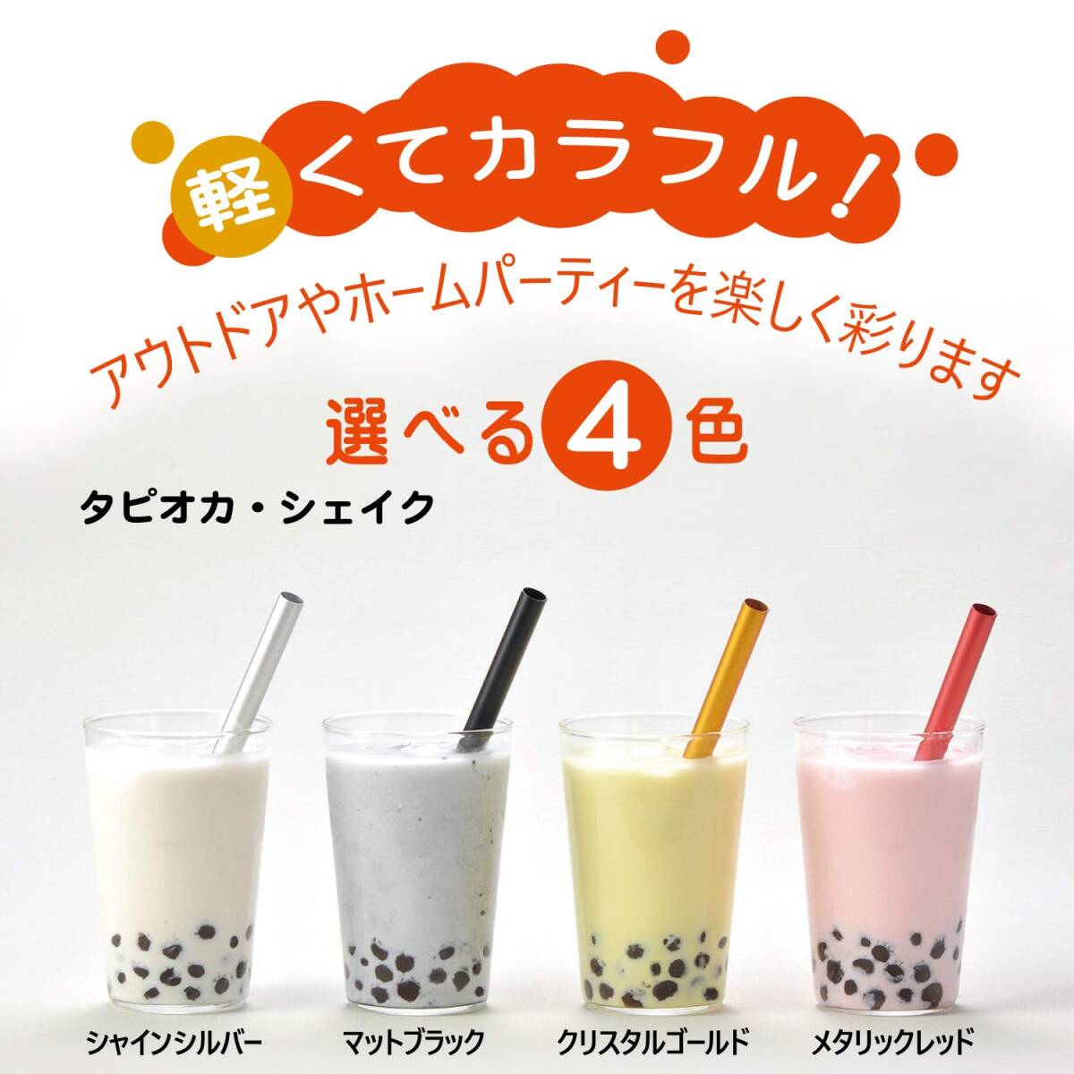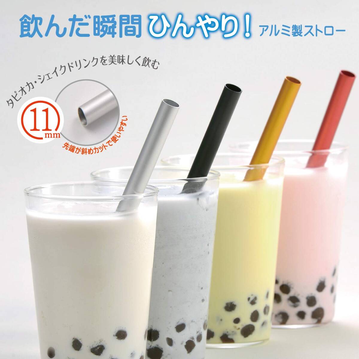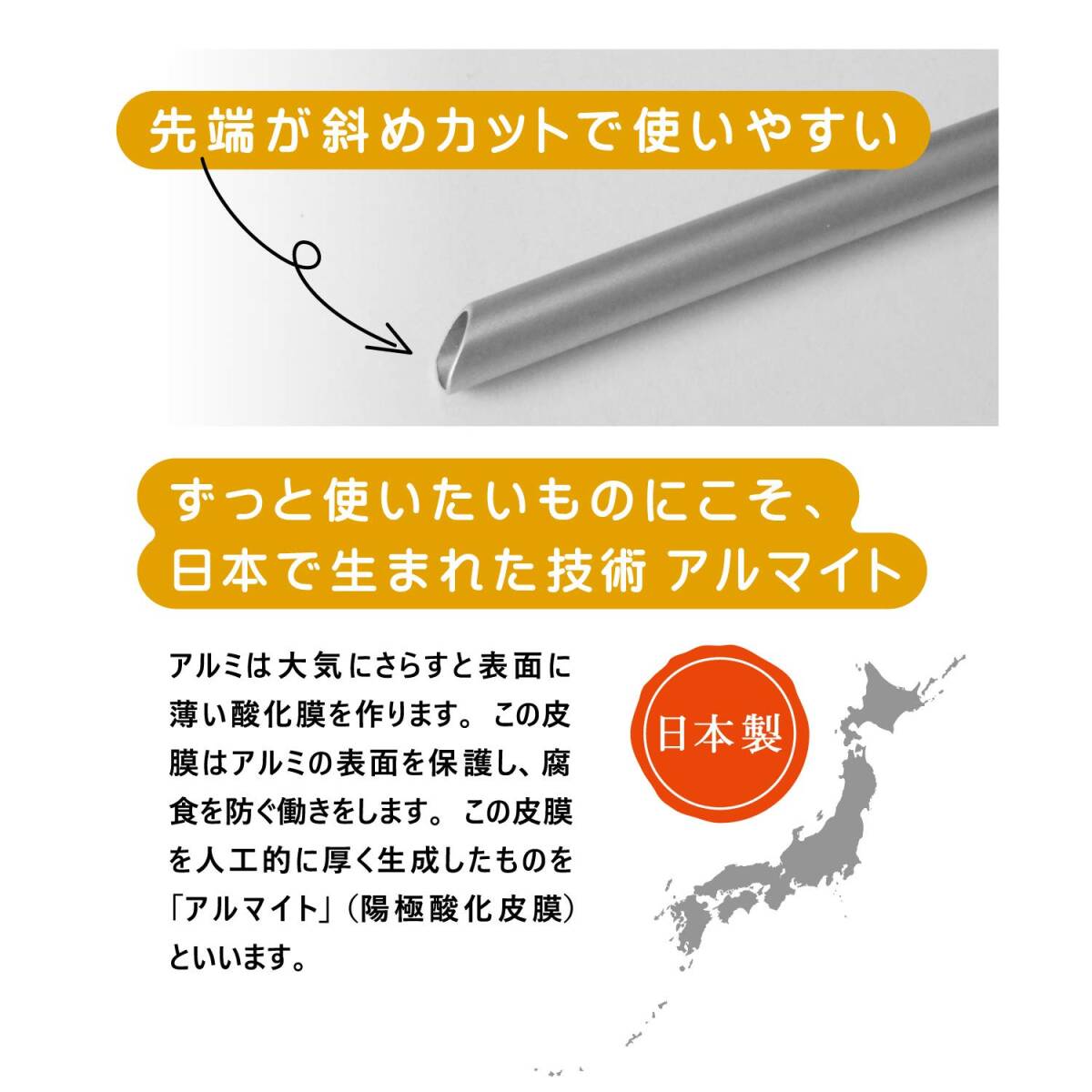 【熱伝導のよいアルミ製ストロー】アルミニウム製で、一般的なステンレスの12倍の熱伝導冷たいドリンクから、スムージー、シェイク、タピオカまでさらに冷たく、美味しく【ずっと使いたいものにこそ、日本で生まれた技術 アルマイト】表面はアルマイト加工。表面を保護し、腐食、錆に強いアルミは、空気に触れると表面に薄い酸化皮膜を作り、アルミの表面を保護し腐食を防ぐ働きをするこの皮膜を人工的に厚く生成したものが「アルマイト」(陽極酸化皮膜)【軽くてカラフル】アウトドアやホームパーティーを楽しく彩る【先端が斜めカットで使いやすい】先端がストレート形状よりも斜めカットでタピオカも吸いやすい