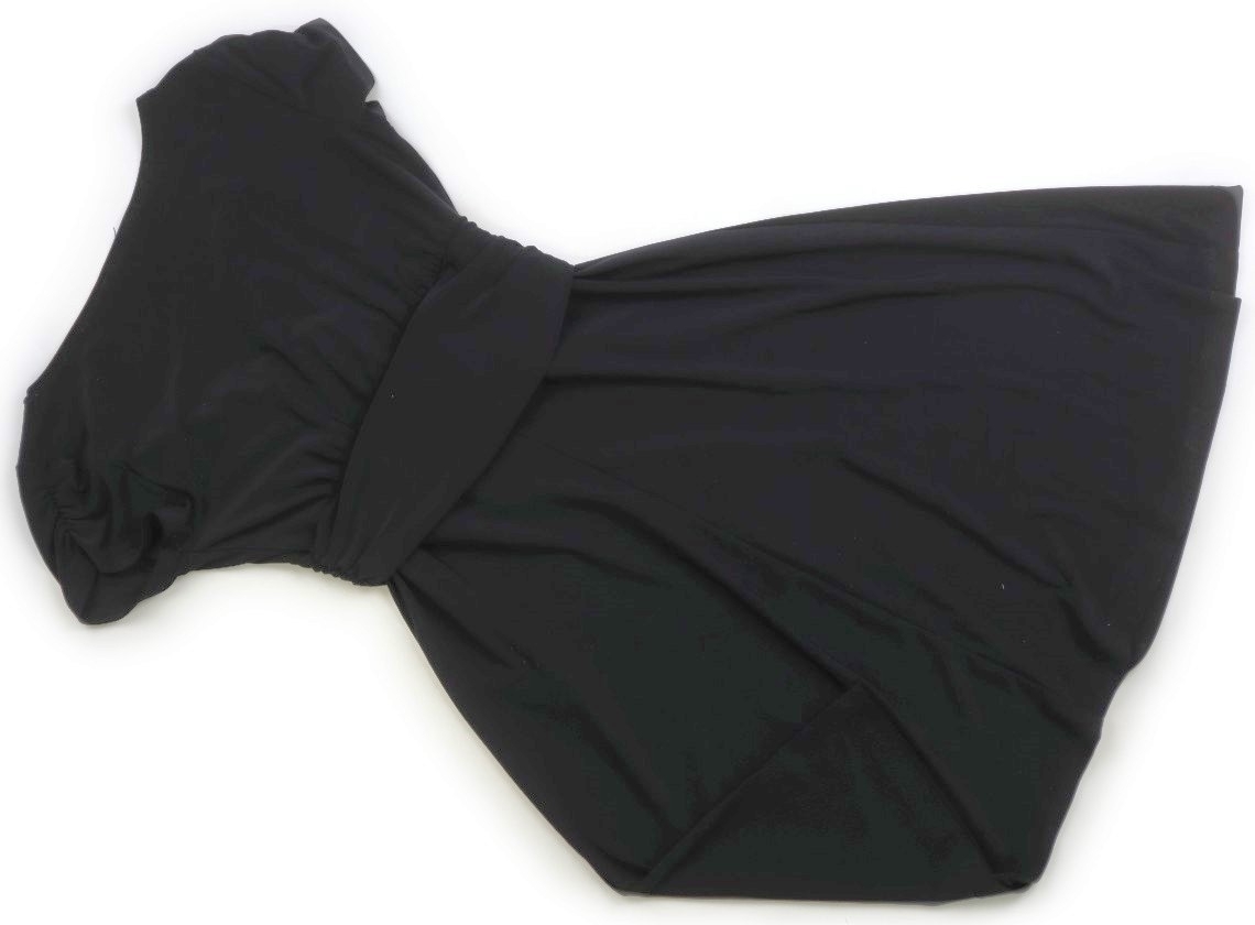 実寸は、肩幅約36.1 cm、サイドネックポイントから総丈約88.7 cm、胸囲約36.3cm(×2平置き実寸)、袖丈約11.4cm。実際のサイズ表記はXSです。伸縮性のあるポリエステル・ポリウレタン素材。裏地なし。腹部やスカート部分細かな毛玉ができています。カシュクールデザインで授乳もしやすそうです。JWタグ。