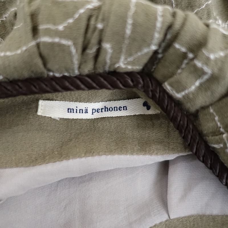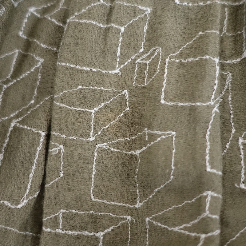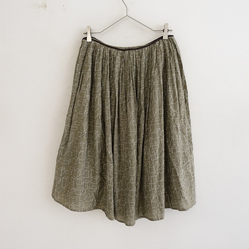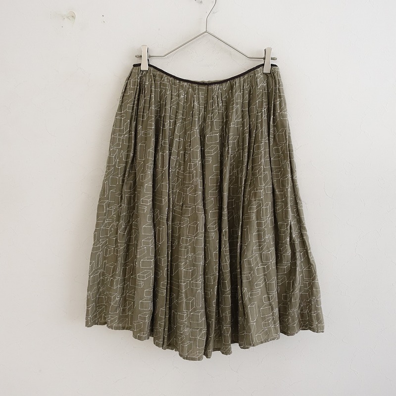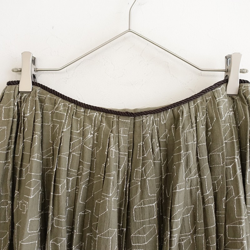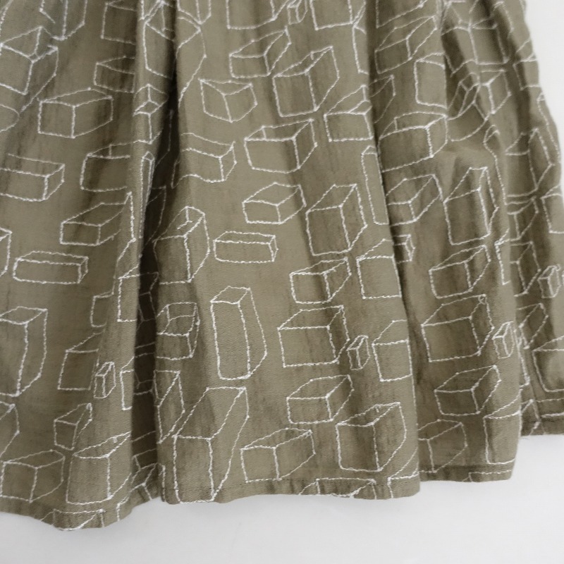 mina perhonenのcubo 刺しゅうスカートです。カラーはカーキベージュで、cuboテキスタイル刺しゅうがあしらわれた薄手のコットン地で仕立てられています。サイドのファスナーで着脱でき、ウエストにはダークブラウンのロープひもが施されています。裏地付きです。 |