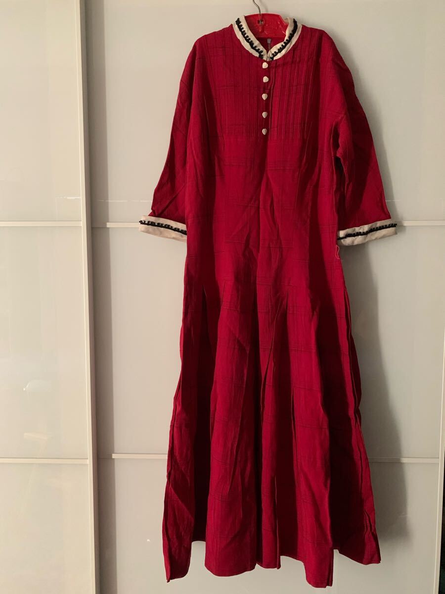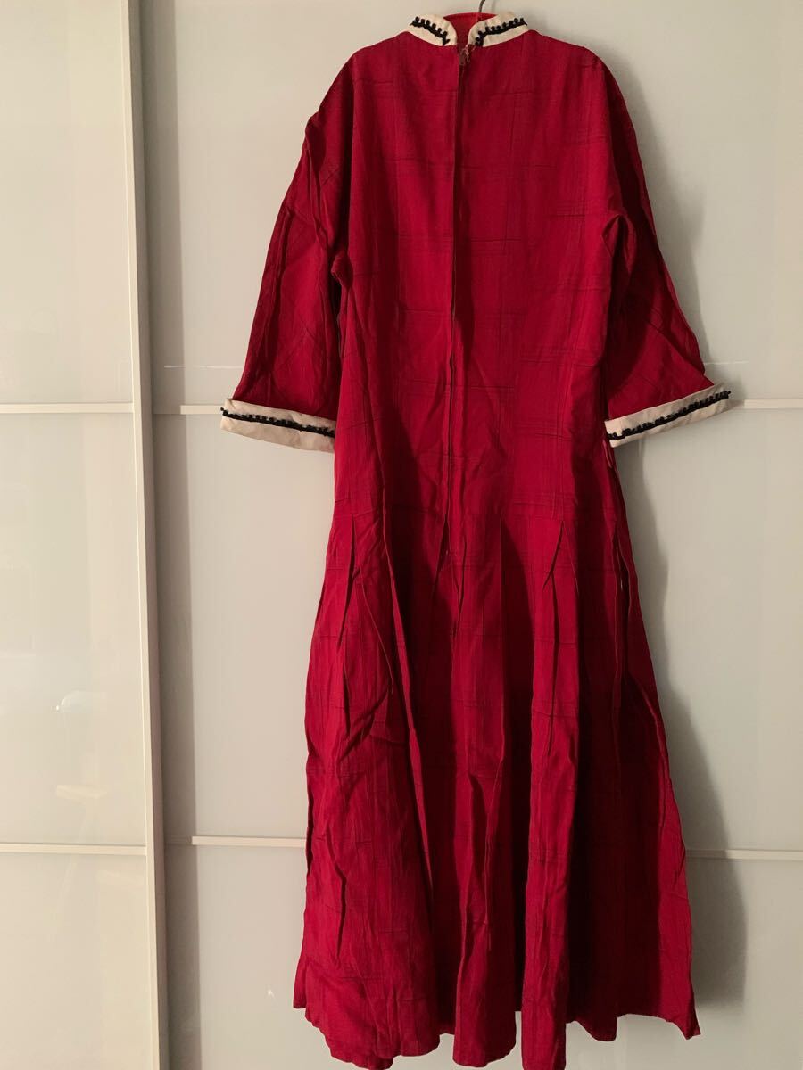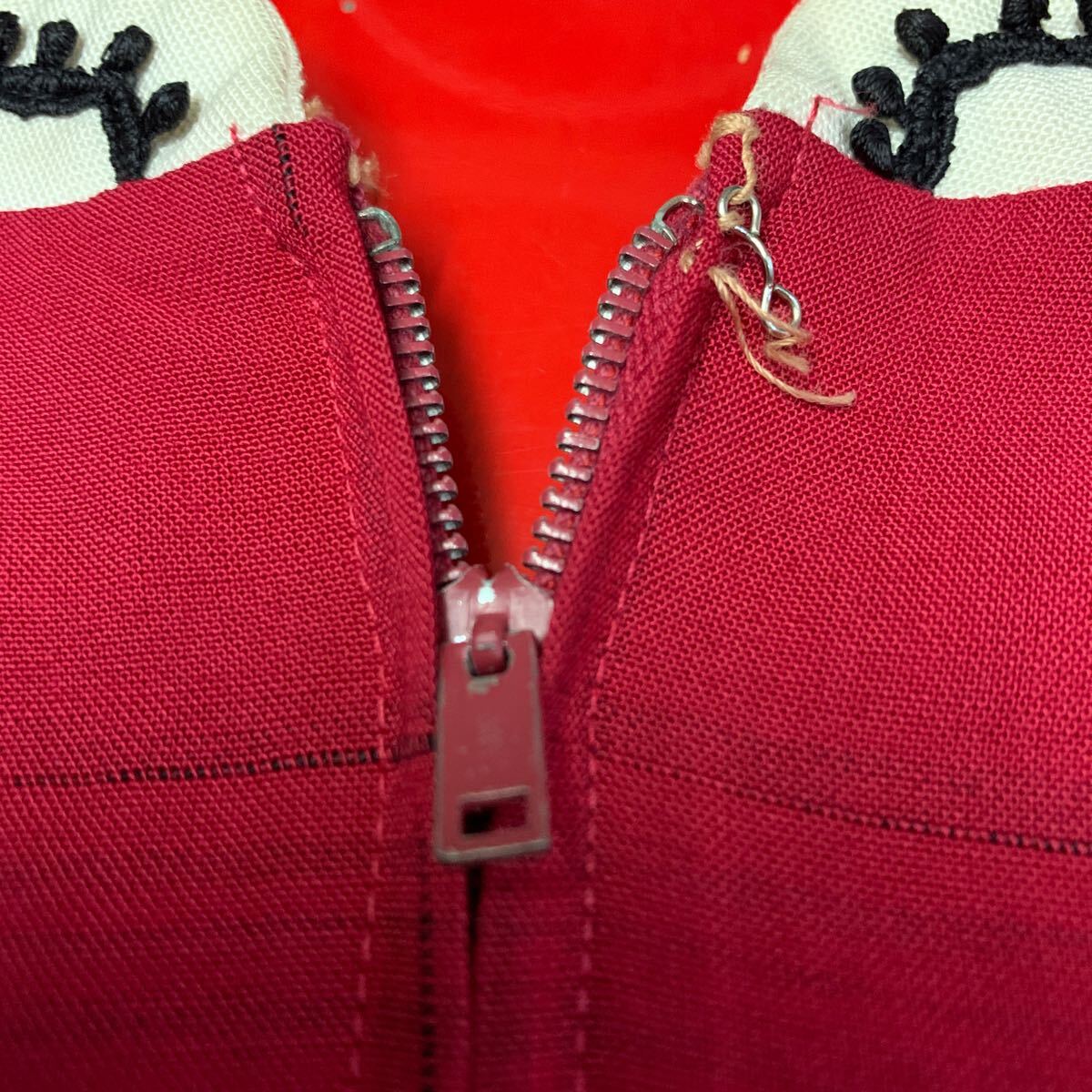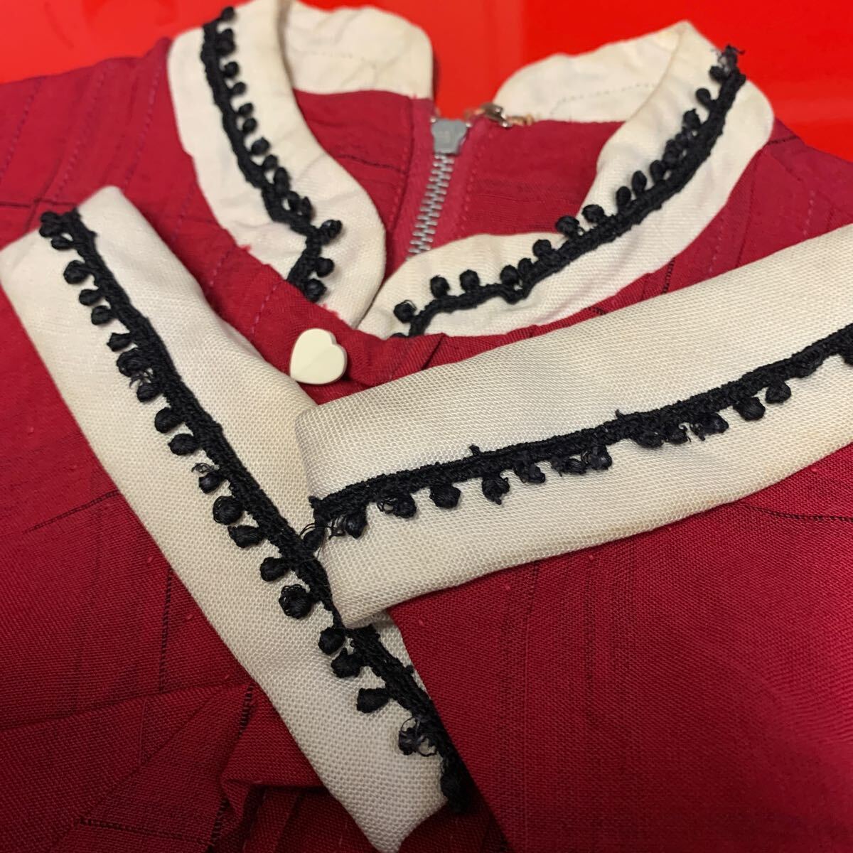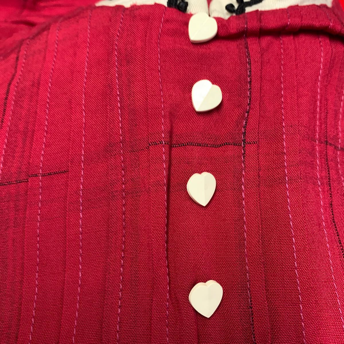 胸の飾りボタン(写真4)。裾付近と生地の裏側(写真5)。襟、袖の白い生地に薄汚れがあります(写真6)。