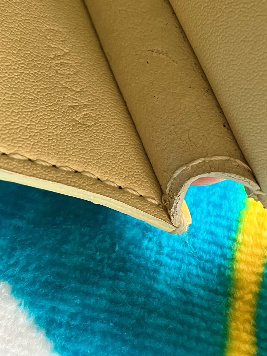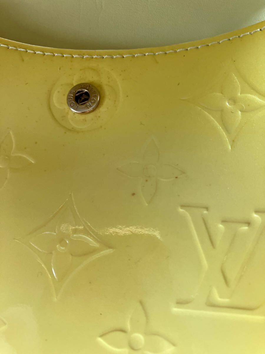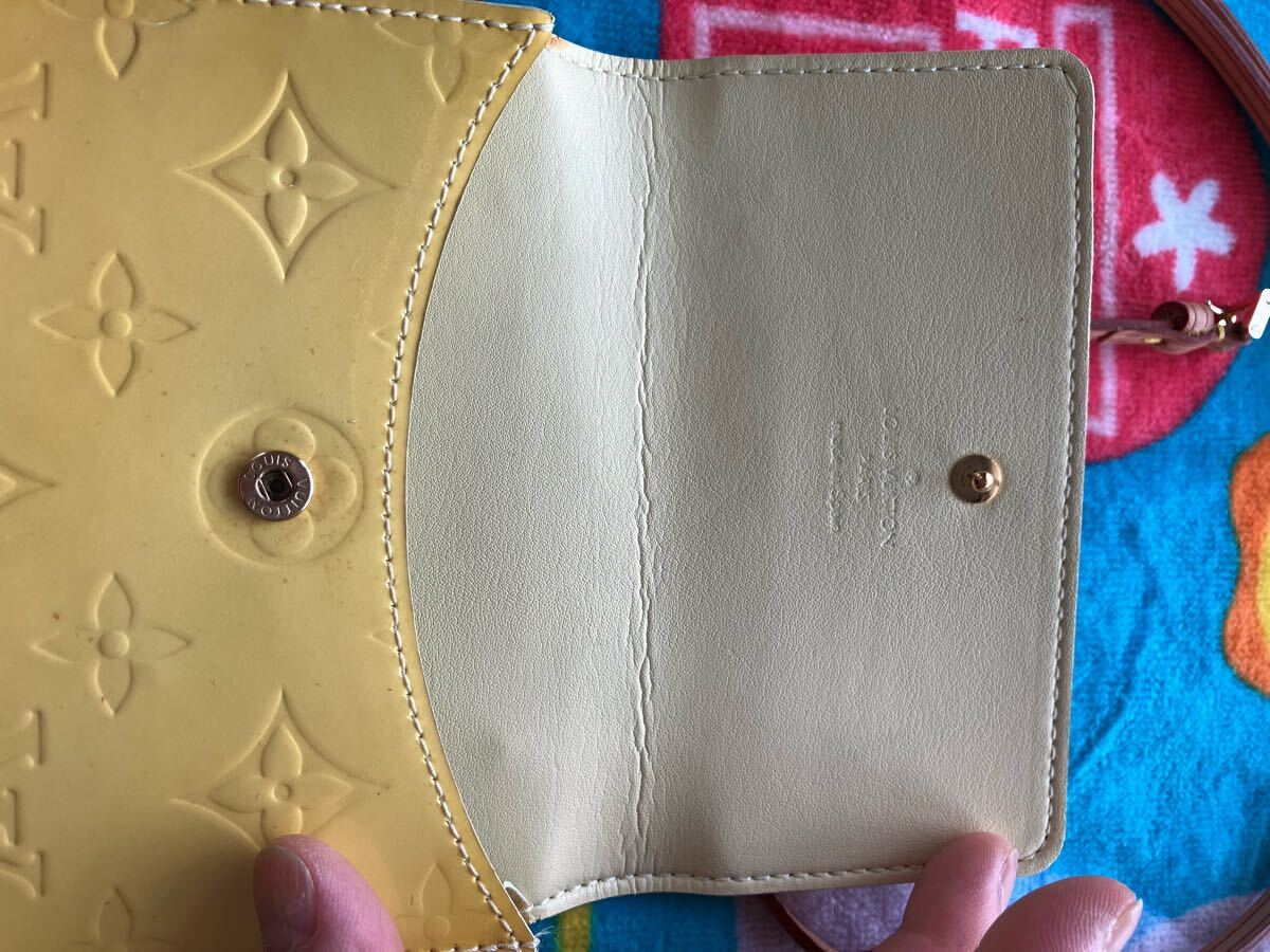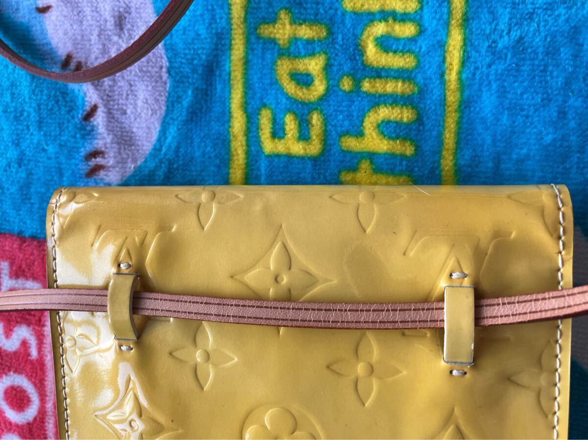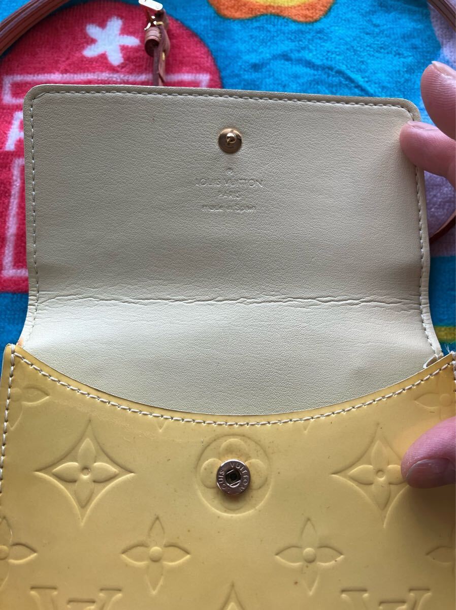 ヴェルニは色移りやヤケが出やすいので、経年並みの色ヤケ、表面のベタ付きがあります。紐はヤケが強かったので、別のモンスリの紐を注文するついでに買い換えました。経年並みの物ですが、サコッシュのように今ならまたお使いに慣れると思います。