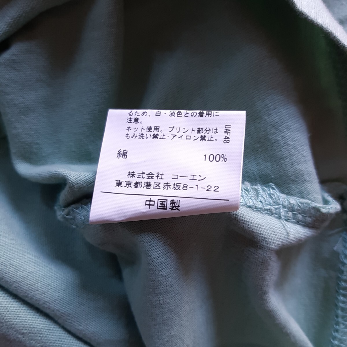 コーエンのうす緑色のプリントデザインTシャツ、綿100%で快適な着心地。