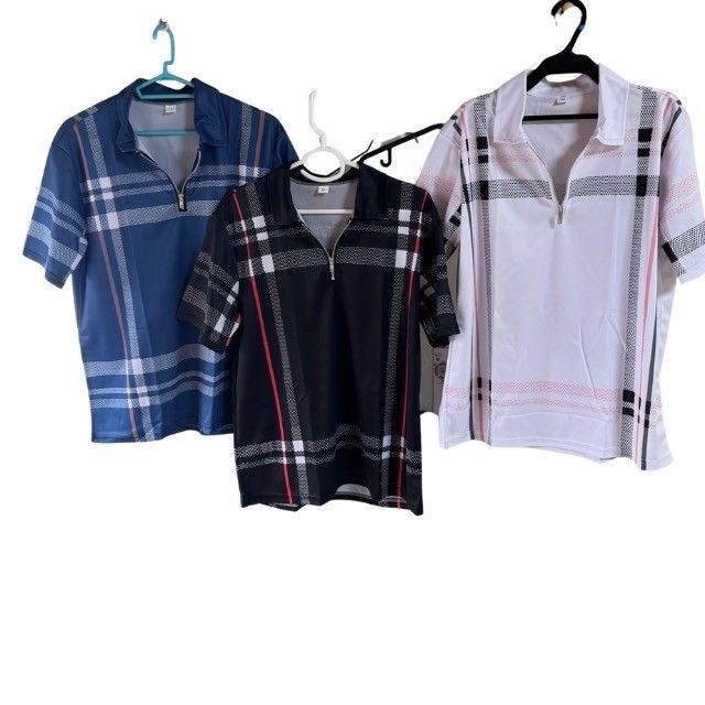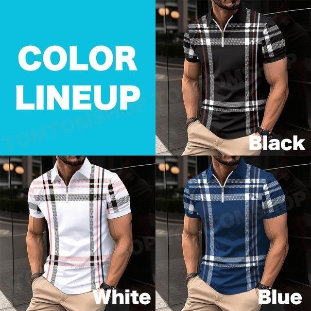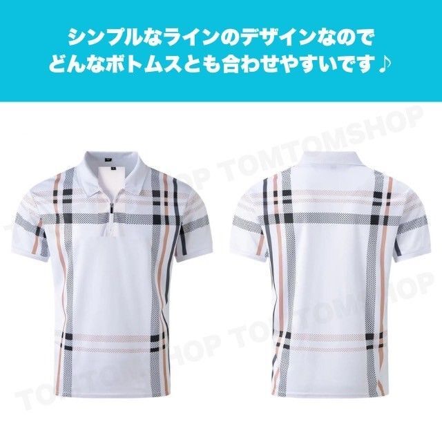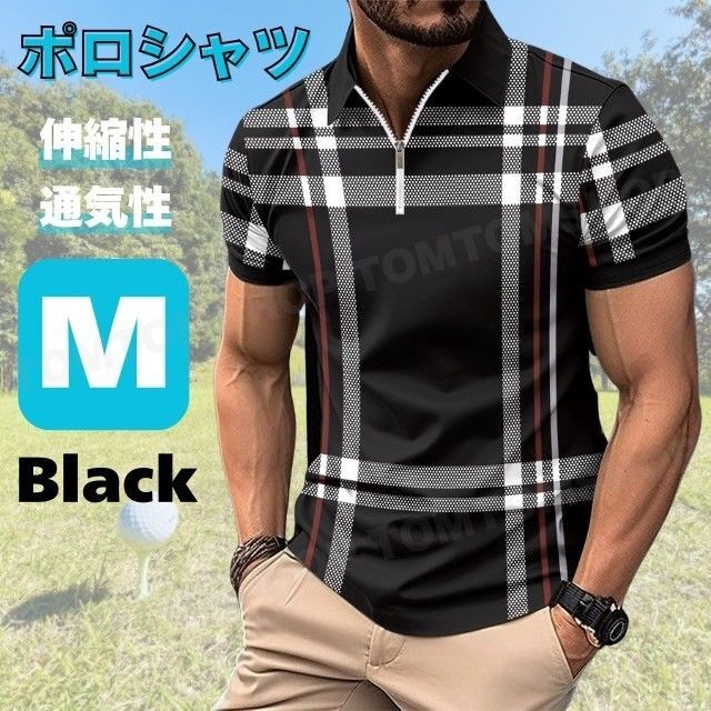 ポロシャツ メンズ / 半袖 / チェック柄 / 薄手 / ジップアップ / ゴルフ / スポーツウェア / 通気性 / ストレッチ / 大きいサイズ / 夏服 / プレゼント / クールトップス / 黒 / 青 / 白