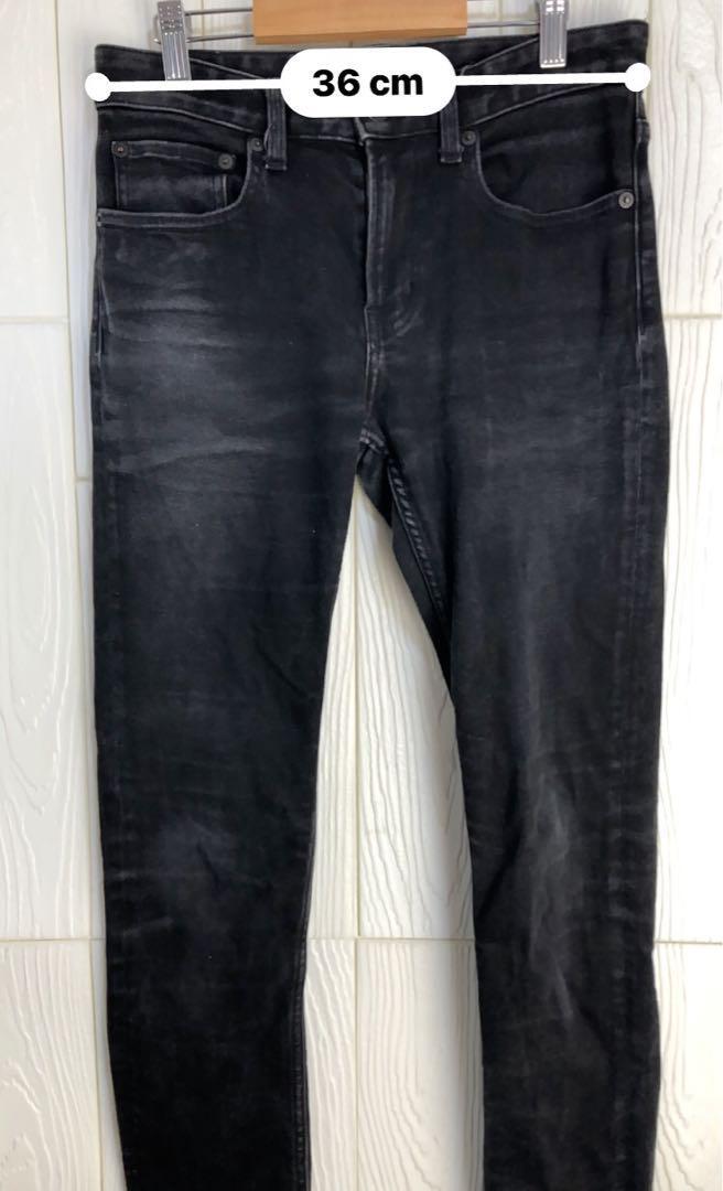 スキニーデニム、ブラック、ウエスト72cm、股下72cm、前股上21cmのフィット感が特徴。