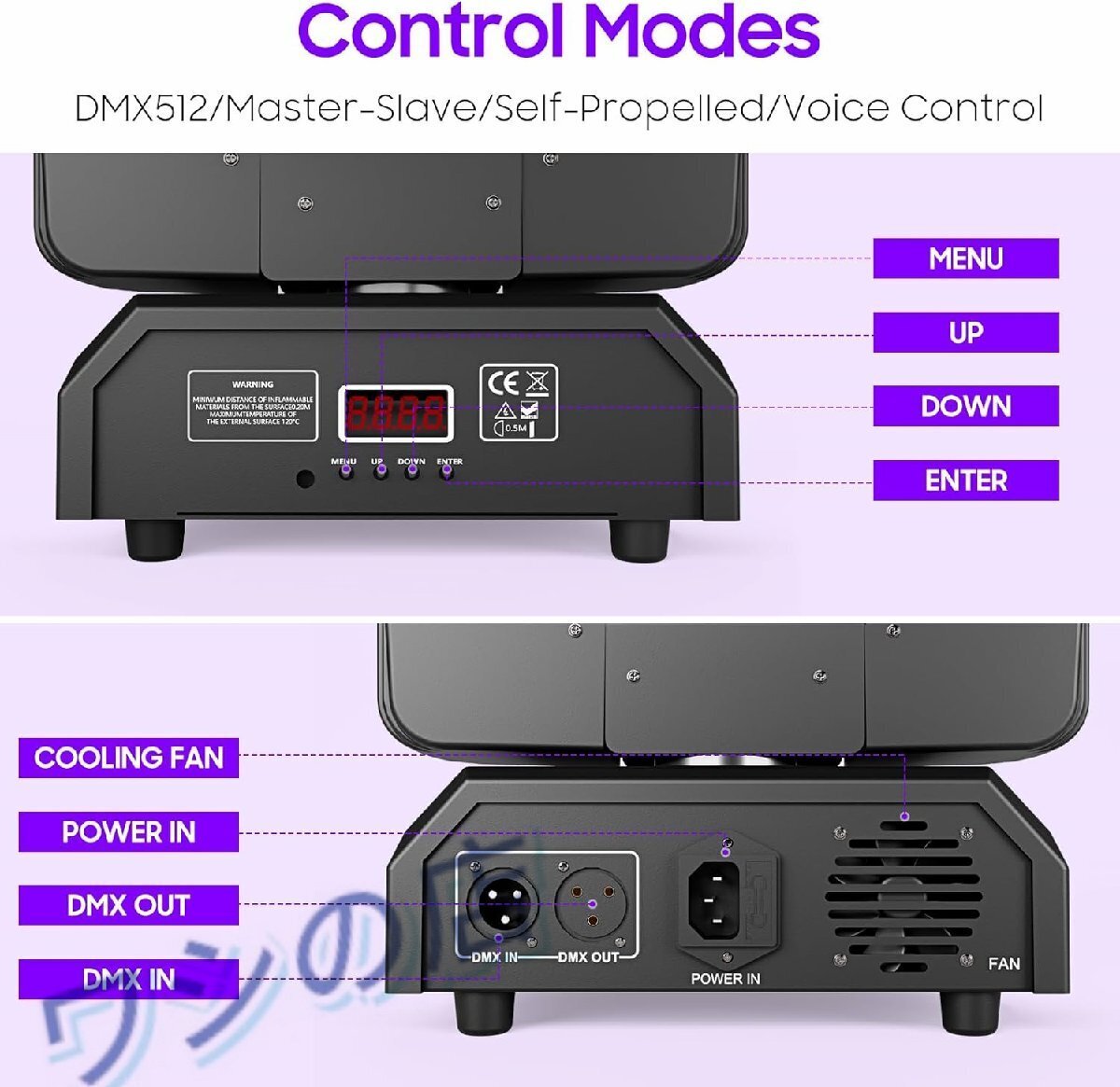 サウンドアクティベート&DMXコントロール:オート、DMX512、サウンドアクティベーション、マスタースレーブのヘッドステージライト操作モード。 サウンドモードに設定するだけで、照明効果は音楽のビートや周囲の音に合わせて変化します。 DMXモードに変更したり、他の照明器具と一緒にプログラムを編集したりして、よりプロフェッショナルな使用にすることもできます。