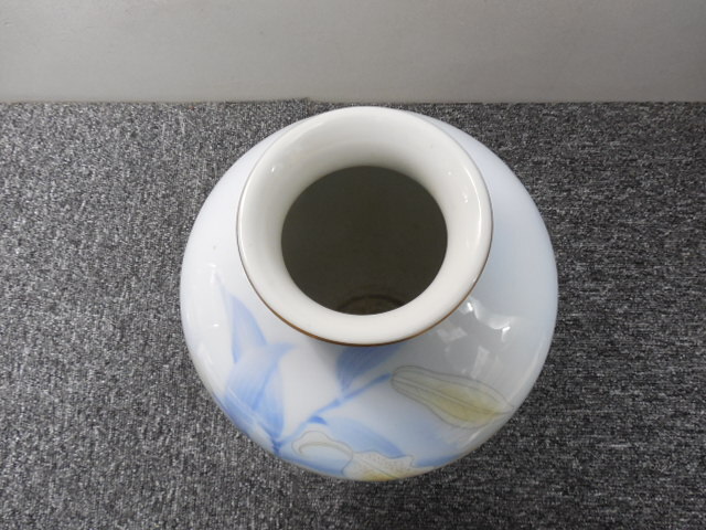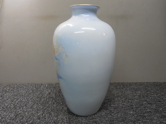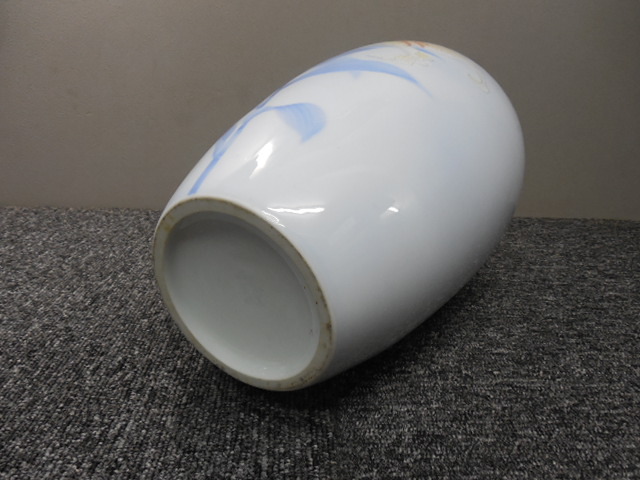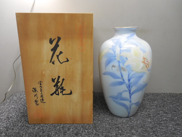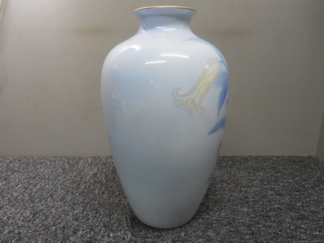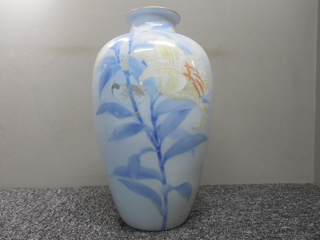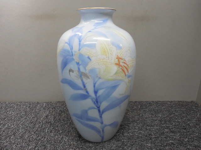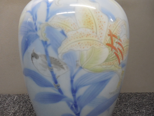 深川製磁・高級・花入れ・百合・鳥・柄  /  ビンテージ・共箱あり  サイズ・全高32×胴幅18×口径9㎝