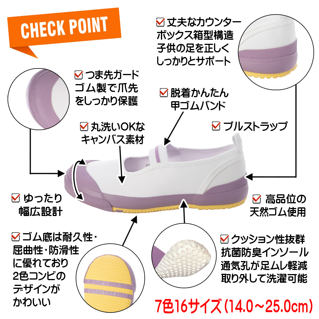 7色のカラーバリエーション、14.0cm~25.0cmと豊富なサイズをご用意しました。デザイン性と機能性に優れて、子供に喜ばれる一足です。