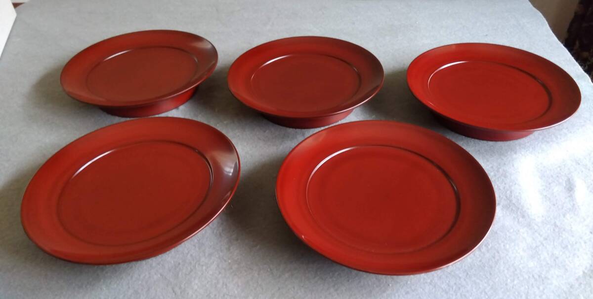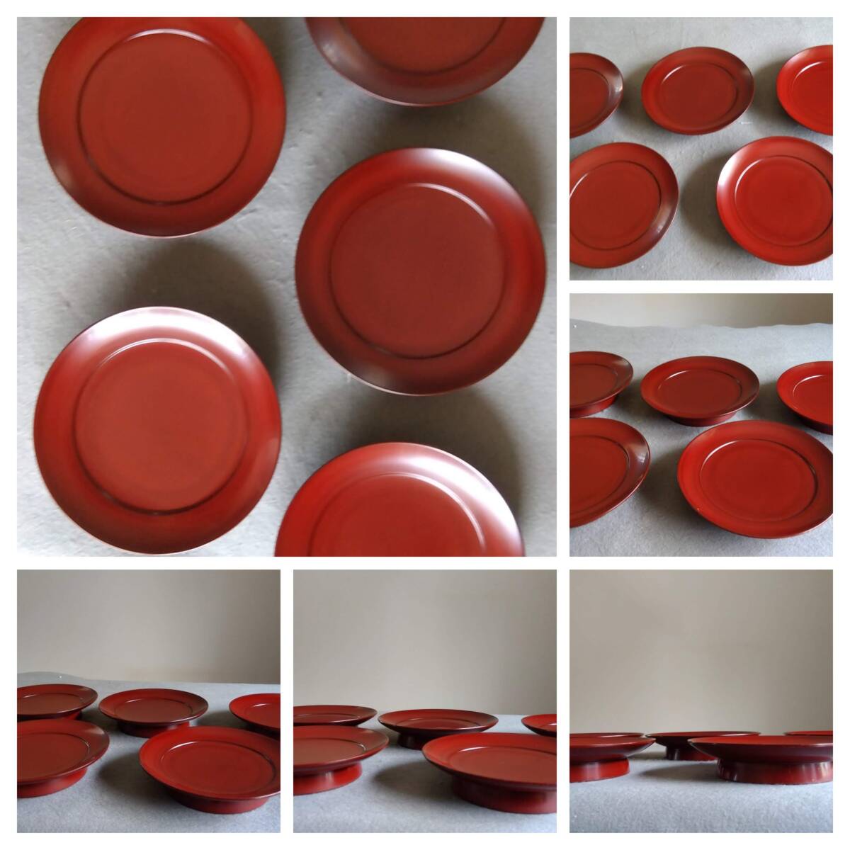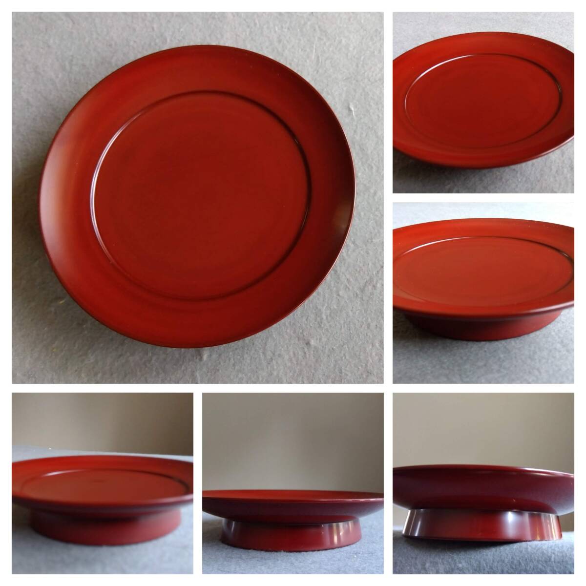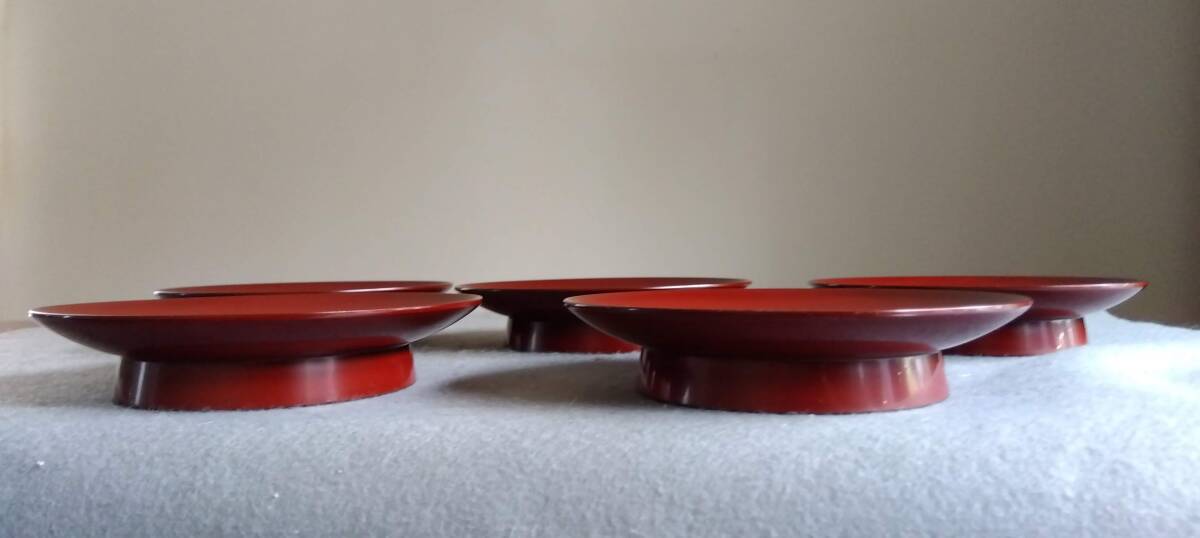 通産大臣指定伝統工芸品越前漆器 根来塗 極上品質兼用皿揃【多目的中皿・菓子皿】5客セット 凡そ2mm幅の極薄口縁は20mm幅のリム円に囲まれた12mm深み見込み部を取り囲み少し高めの15mm高高台で支持された 全高30mmの品位風趣ある伝統工芸品越前漆器兼用皿揃です。 黒漆高台底が透明感のある根来塗赤漆を一層際立たせている日常雑器を超えた素晴らしい逸品です。 サイズ:玉縁口縁2mm 見込み12mm 長口径140mm短口径100mm 高台径95mm高15MMX底幅2MMX底深さ13mm 全高30mm