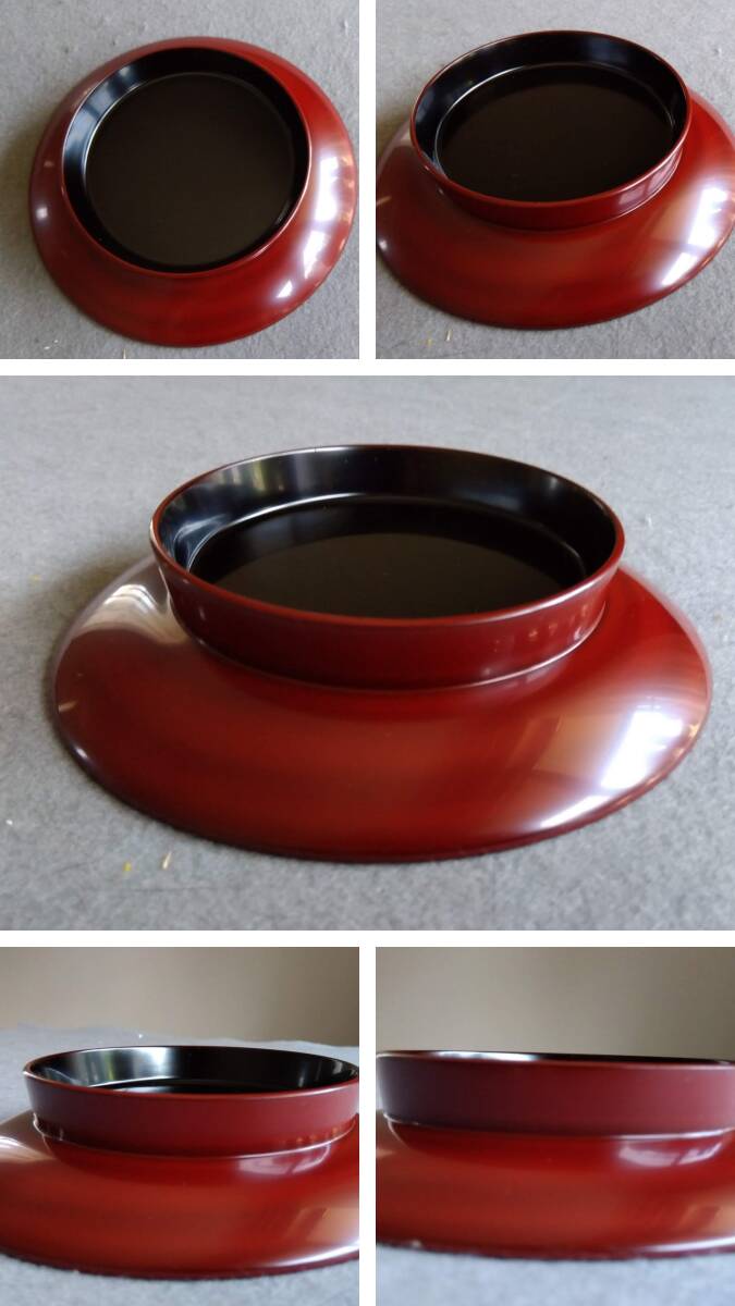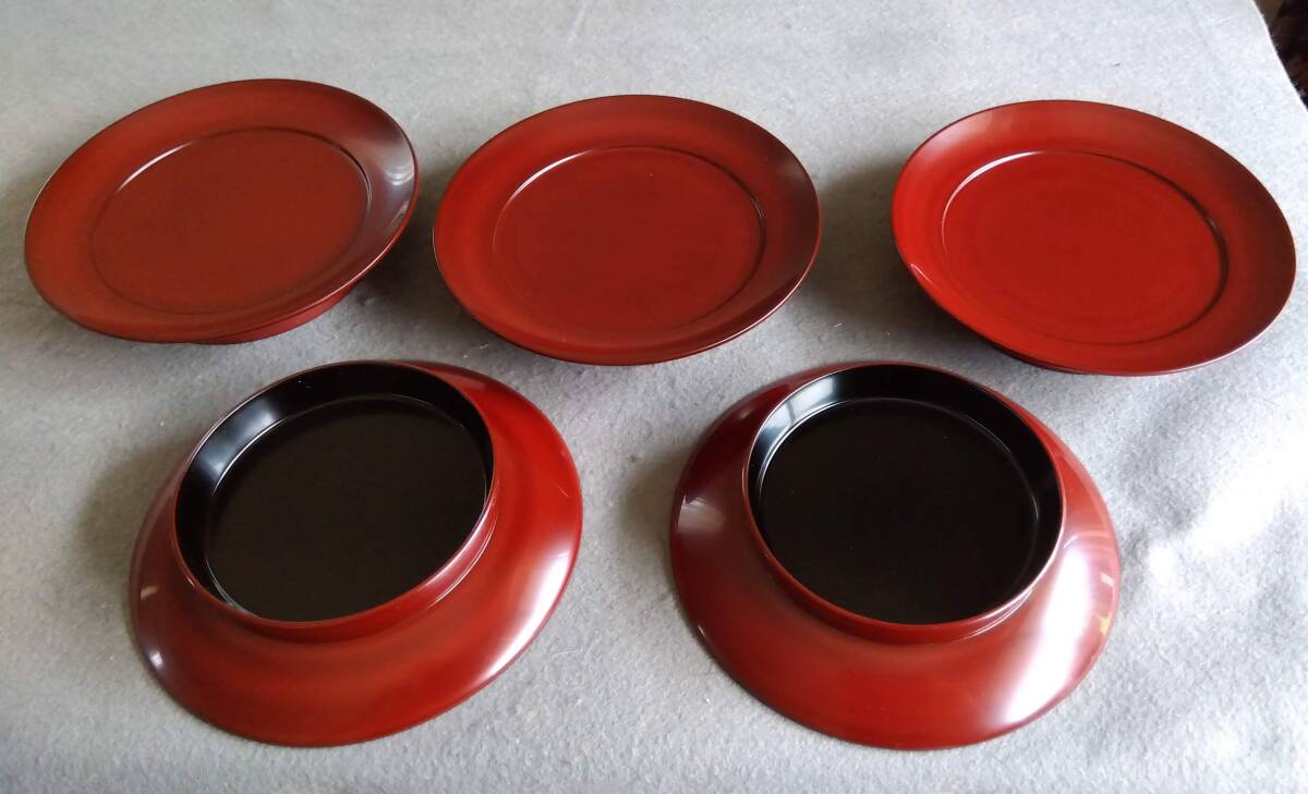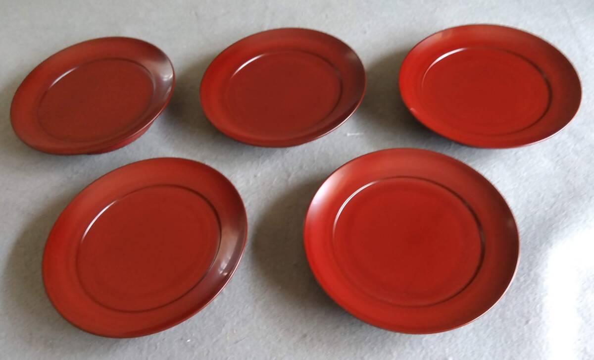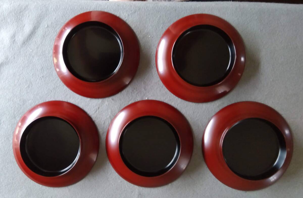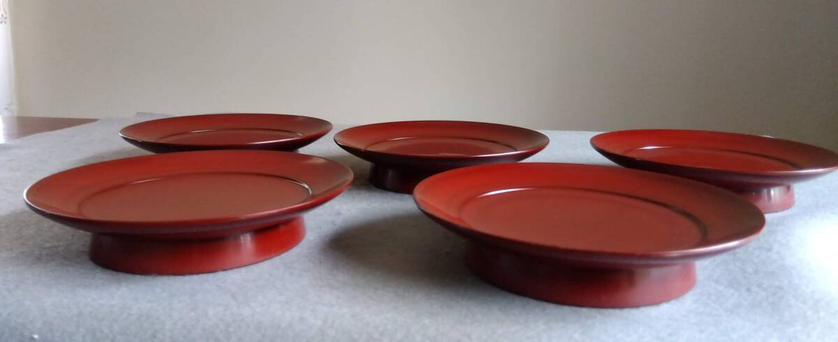 通産大臣指定伝統工芸品越前漆器 根来塗 極上品質兼用皿揃【多目的中皿・菓子皿】5客セット 凡そ2mm幅の極薄口縁は20mm幅のリム円に囲まれた12mm深み見込み部を取り囲み少し高めの15mm高高台で支持された 全高30mmの品位風趣ある伝統工芸品越前漆器兼用皿揃です。 黒漆高台底が透明感のある根来塗赤漆を一層際立たせている日常雑器を超えた素晴らしい逸品です。 サイズ:玉縁口縁2mm 見込み12mm 長口径140mm短口径100mm 高台径95mm高15MMX底幅2MMX底深さ13mm 全高30mm