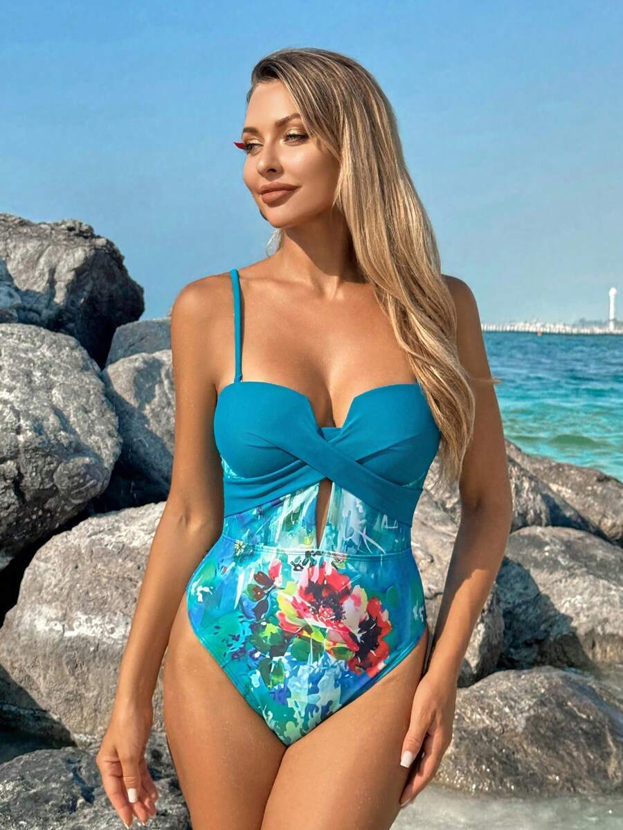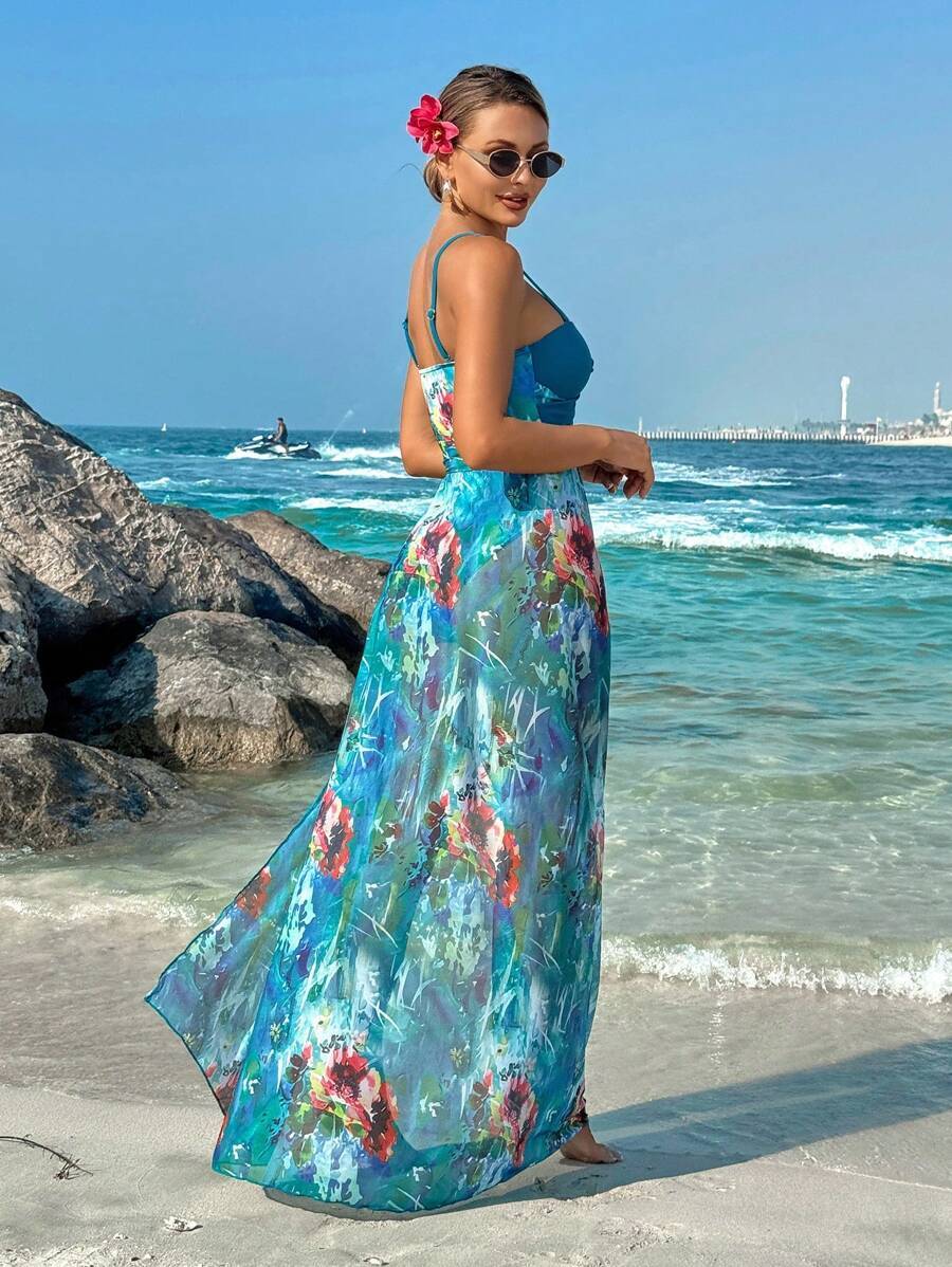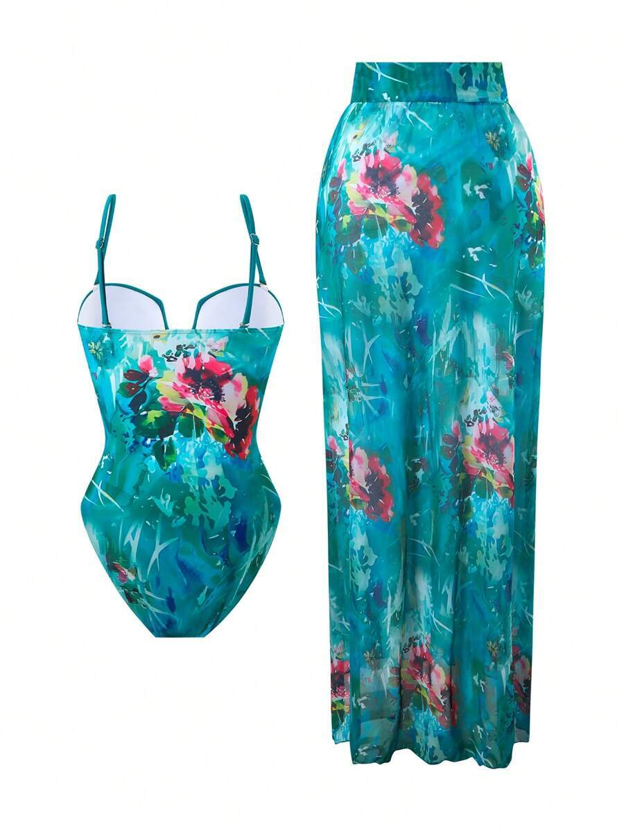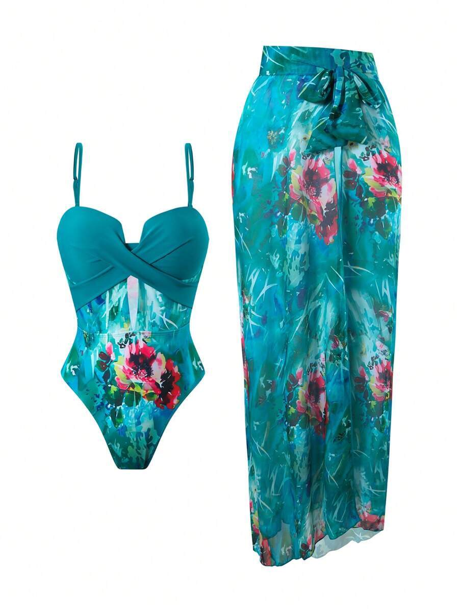 レディース 水着 ワンピース ミニマリスト プリントクロップドトップとロングプリントメッシュオーバーレイマキシスカート 2点セット