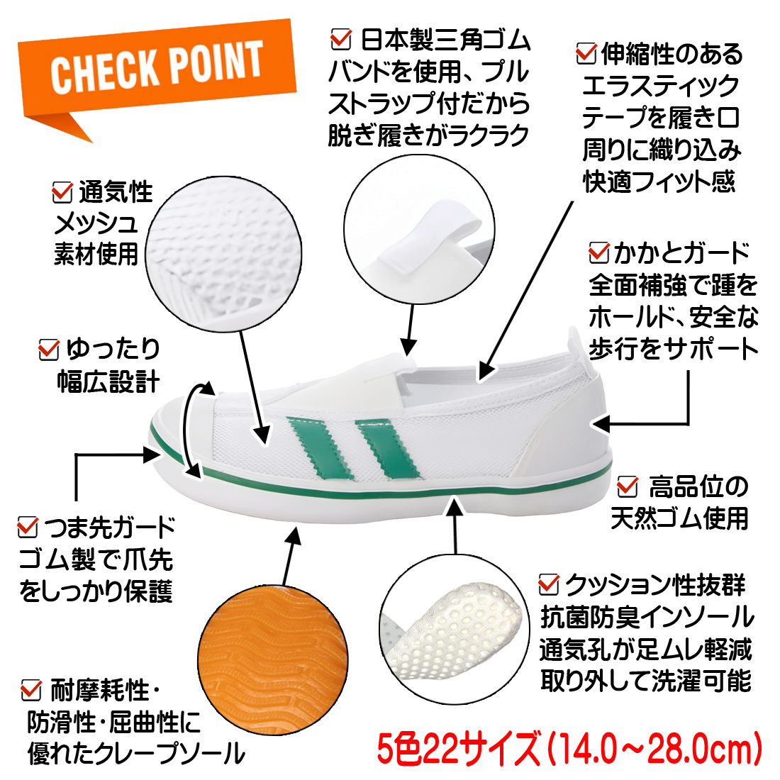 5色・22サイズのバリエーションを豊富に用意しており、子供から大人まで対応。通園・通学・通院・研修での使用はもちろん、リハビリ・介護など、幅広い場面で活躍する一足です。