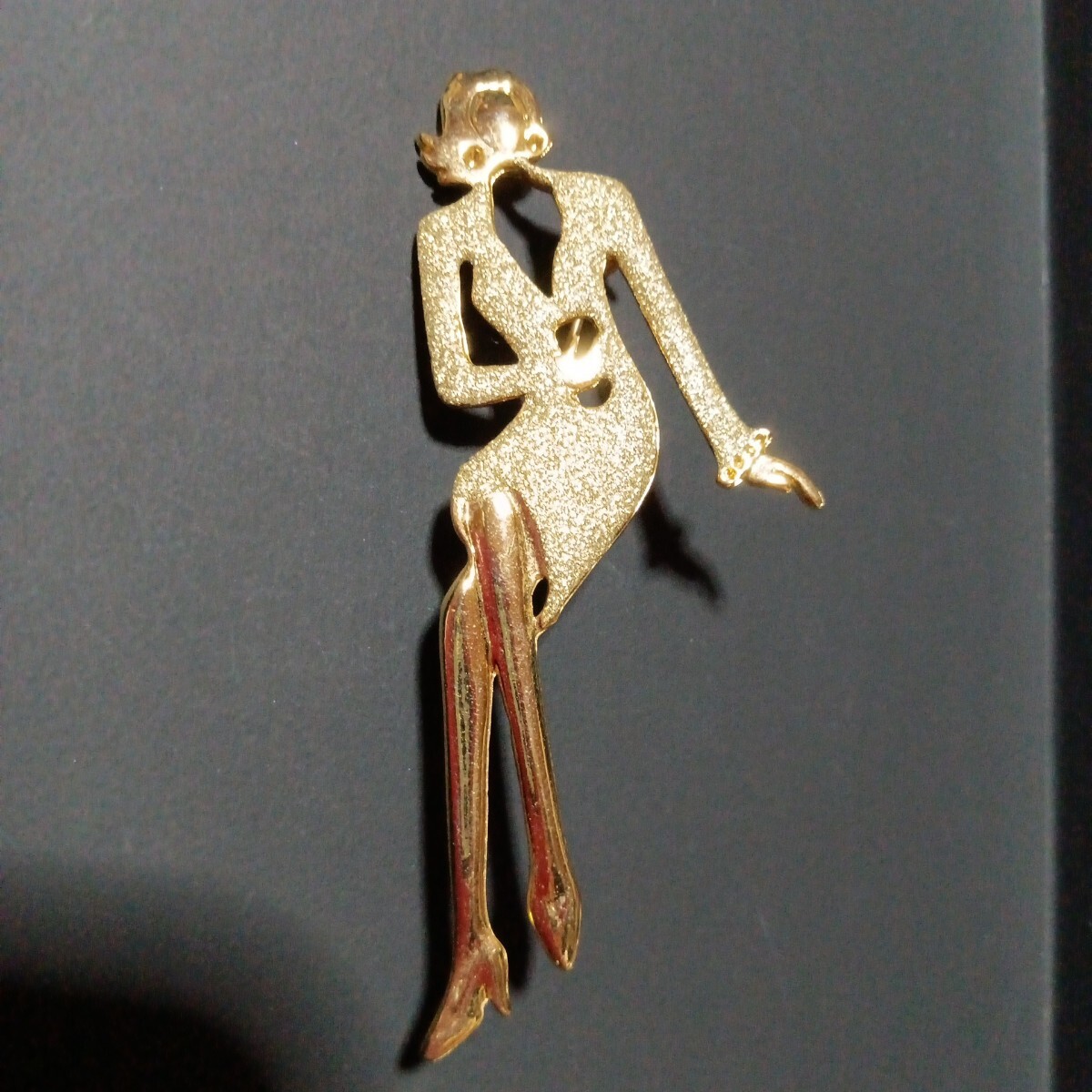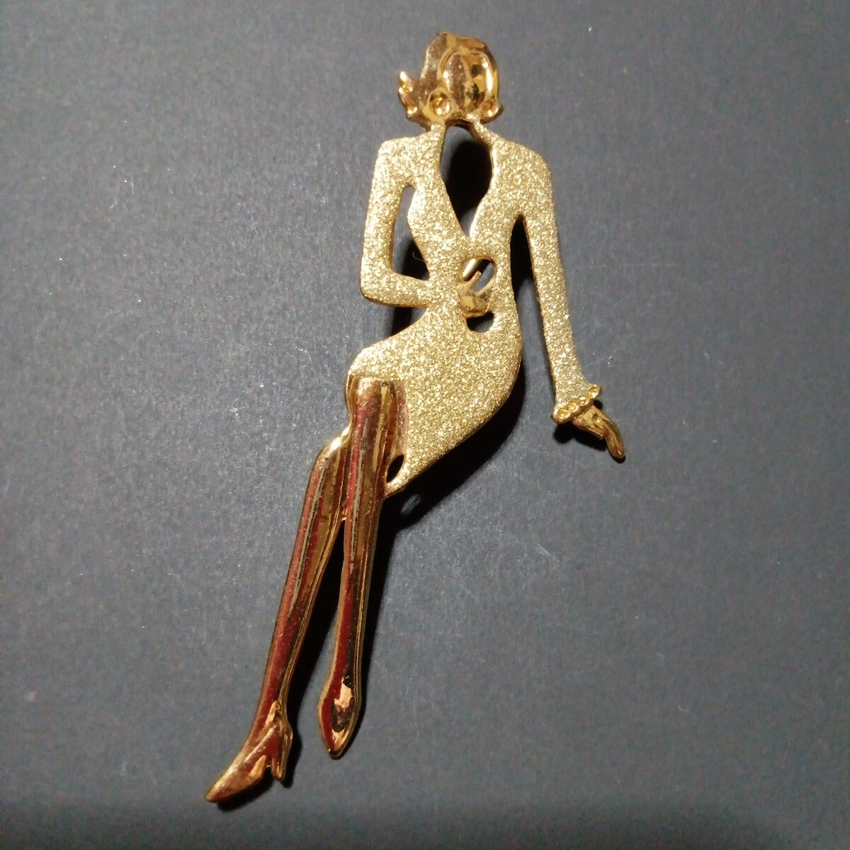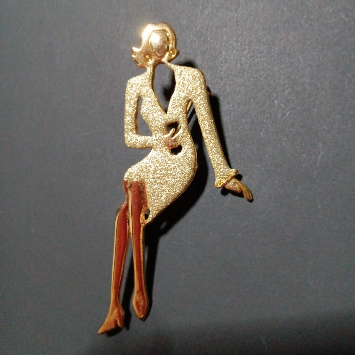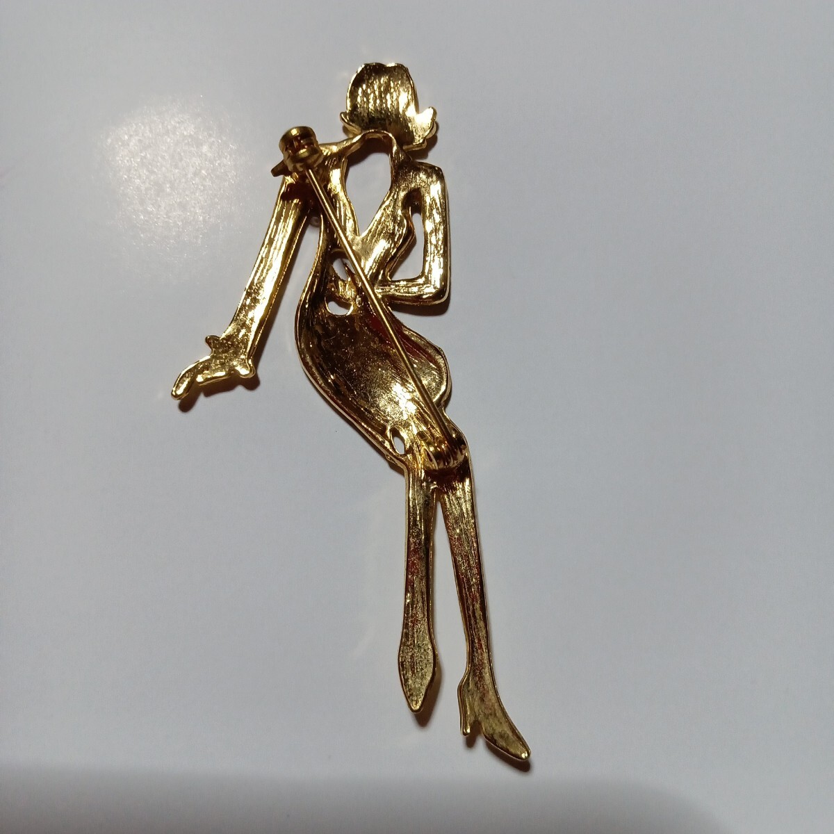 おしゃれなゴールドのスーツに身を包んだ女性モチーフの素敵なヴィンテージブローチです。スタイリッシュでファッションセンスの良さを感じるような都会的な雰囲気を感じます。さほど重量感は感じませんので着け易いかと思います。カジュアルにもフォーマルにもお使い頂けるデザインかと思います。縦長サイズで目を惹きますので、お洋服の他、バッグや帽子に付けて頂いたり、インテリアとして飾って頂くのも面白いかと思います。大切な方へのプレゼントにも。