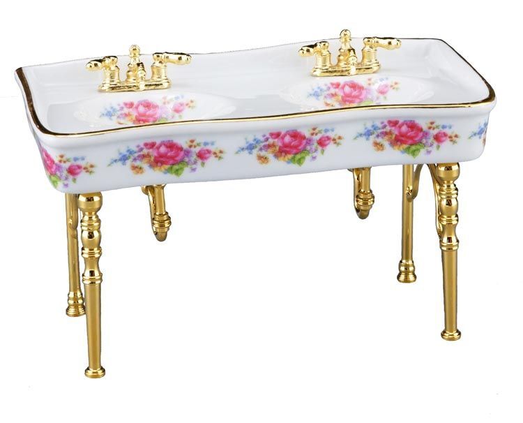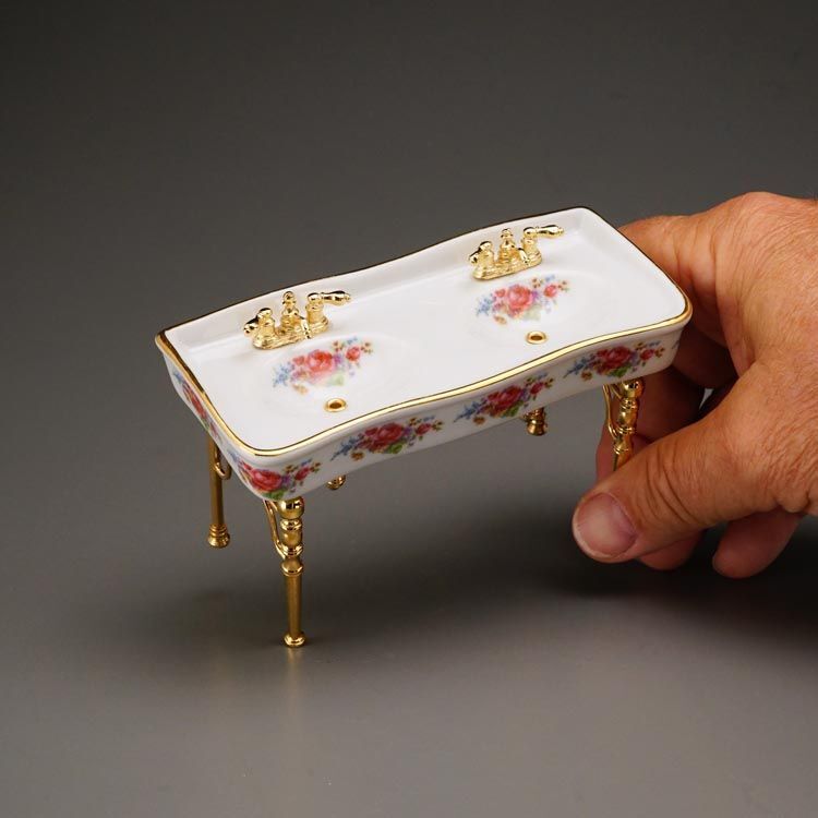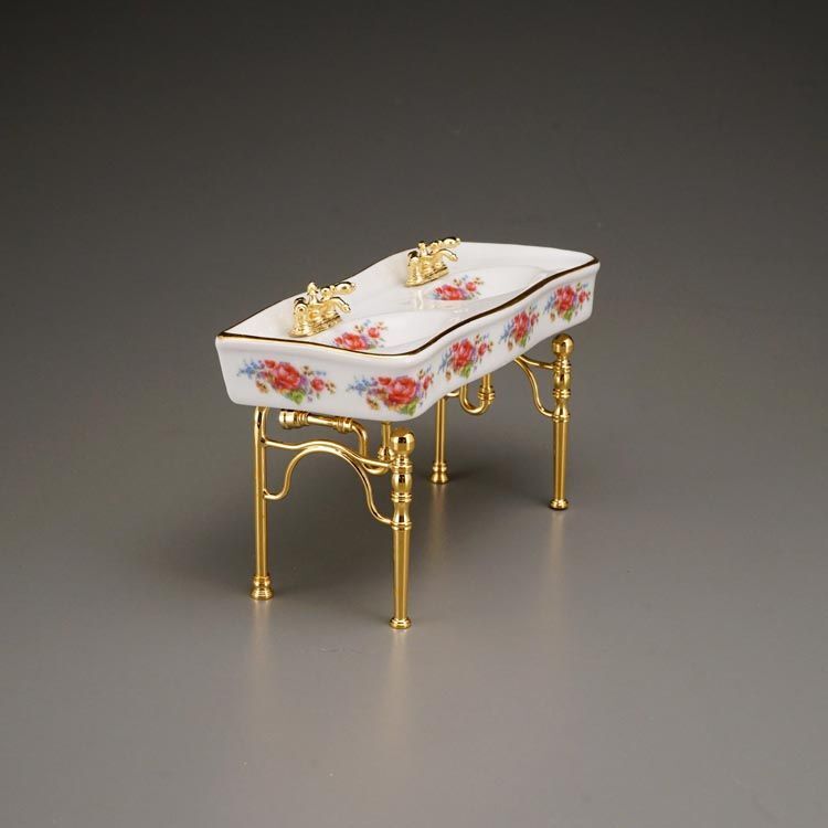 ドイツロイター社製のミニチュアです。スケールは1/12です。日本の一般家庭ではあまり見かけないゴージャスな洗面台ですね!ホテルライクな、ゴージャスなドールハウスに、ぜひいかがでしょうか?※写真では足の部分が暗いお色に見えますが、実物は鮮やかで明るい金色です。サイズ:W115xD50xH62ミリ。