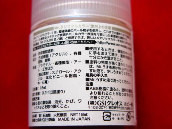 Mr.HOBBY 超微粒子!パールカラー 合成樹脂(アクリル)塗料 成分=有機溶剤顔料 正味量=18ml 塗り面積=0.2平方メートル(3回塗り) プラモ、模型、工作他 アクセサリーの製作などに♪ キラキラの綺麗なラメっぽいカラーです ※モニターによって色目が多少違って見える場合があります ※パッケージデザインが写真と異なる場合が有ります ------------------------------------------------------ 弊店の出品商品は手持ち在庫品です 極々稀に入れ違いで売り切れてしまい間に合わない場合もありますがご了承下さい |