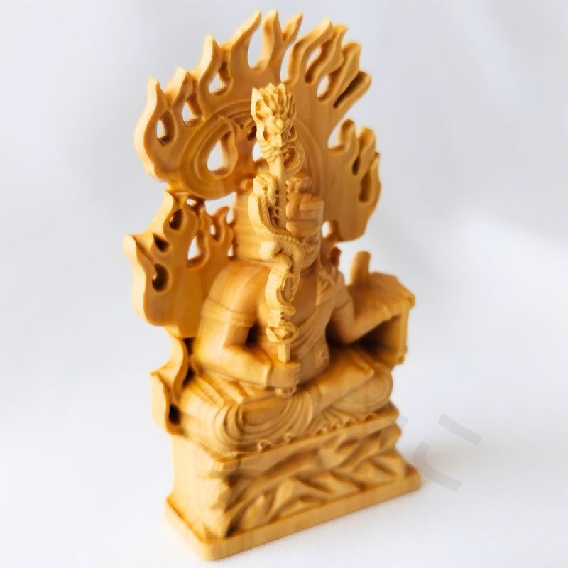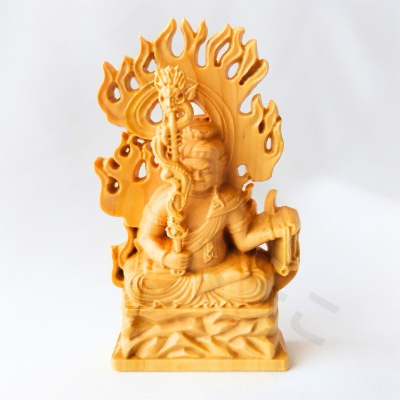 密教における明王の一尊で、大日如来の化身とされています。忿怒相という恐ろしい形相ですが、これは煩悩や悪を打ち砕くための力強い姿を表しています。また、右手の剣で人々の煩悩を断ち切り、左手に羂索という衆生を救済するための縄を持っています。不動明王の周りの炎は、煩悩を焼き尽くす炎であり常に燃え盛っています。悪を退散させる慈悲深い仏様です。