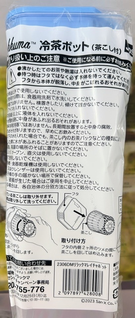 | ☆商品説明☆ | 「☆非売品☆リラックマ 冷茶ポット 約1L 日本製」 【商品詳細】 ・Joshin ノベルティ リラックマ 冷茶ポット(茶こし付) 素 材 :ポリプロピレン(本体、フタ、茶こし) サイズ :高さ/約22㎝ 幅/約7~9㎝ 耐熱温度:100℃ 耐冷温度:-20℃ 実容量 :約1L MAID IN JAPAN 非売品 |