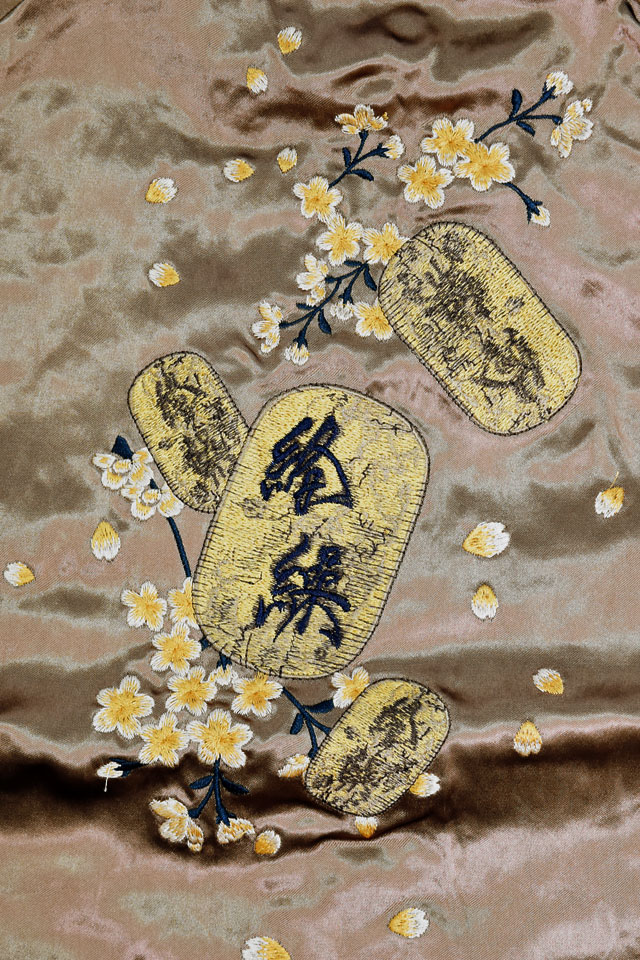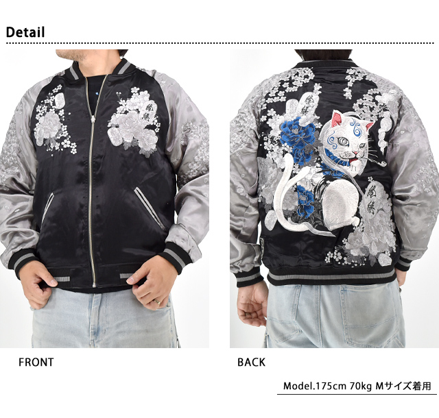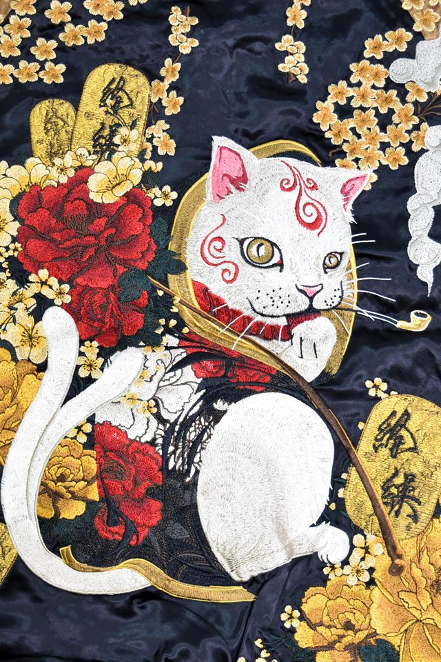 絡繰魂さんから「粋 猫又に小判リバーシブルスカジャン(252040)」のご紹介です。 重みを感じる程の刺繍量が魅力的な粋シリーズから、最新作のスカジャンが登場しました。 モチーフの主役に採用されたのは、近年人気を博している妖怪録・猫又。 今回は小判がセットになった、猫に小判ならぬ、猫又に小判デザインです。 背中には猫又と牡丹の花をダイナミックに刺繍しました。 傍らには小判がしっかりと立てかけてあります。 絵柄は身頃から袖へと続いているため、実際に着用した際にはより立体感をお楽しみいただけます。 表面はしっかり柄の入ったスカジャンですが、対象的に裏面はシンプルに仕上げ、メリハリを付けました。 ボディーにはレーヨンサテンを使用し、ドレープや陰影がくっきりと現れています。 1枚持っているだけでずっと使えるスカジャン。 | ||||||||||||||||||||