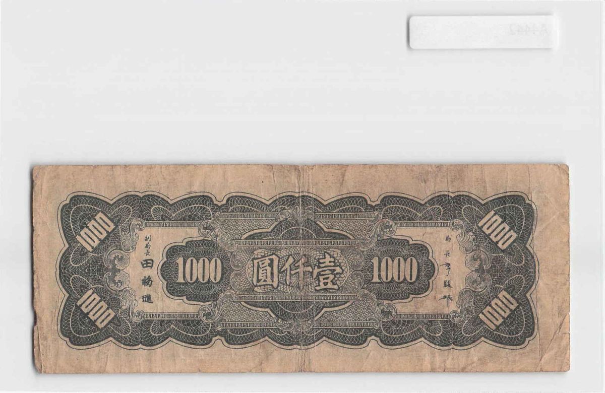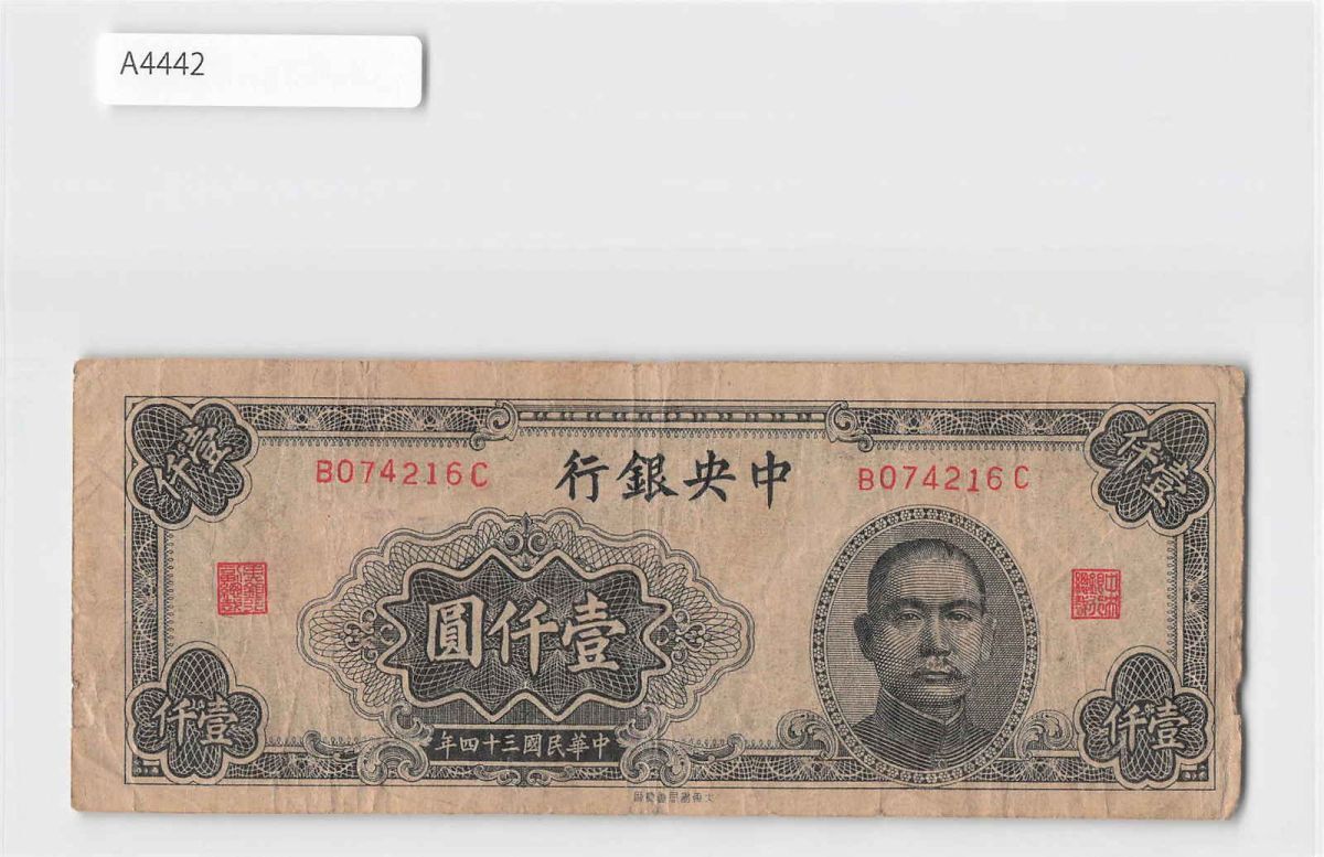 *[令]中国紙幣 中央銀行 1000圓(1945)[A4442]7l9