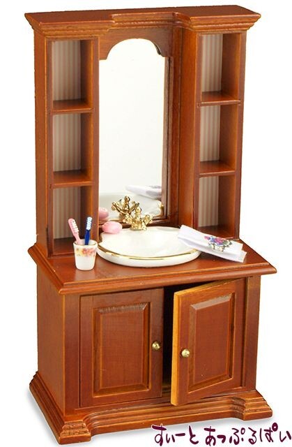 ドイツロイター社製のミニチュア家具です。クラシカルな洗面台に、ちょこっとだけ小物がついています。残りは、貴方次第で美しく飾ってください…キラキラ輝く香水瓶や、本当に香りのするローションボトルを、所狭しと並べたところを想像してみてください。おまけに、ダウンライトのような照明まで付ければ、これだけで素敵なディスプレイになりそうです。まさに大人のホビーです!!※陶器の部分はドイツ製、木製の部分はロイター社デザイン、中国製です。小物は接着されています。扉は開きます。サイズ:W92xD53xH165mm。スケールは1/12です。