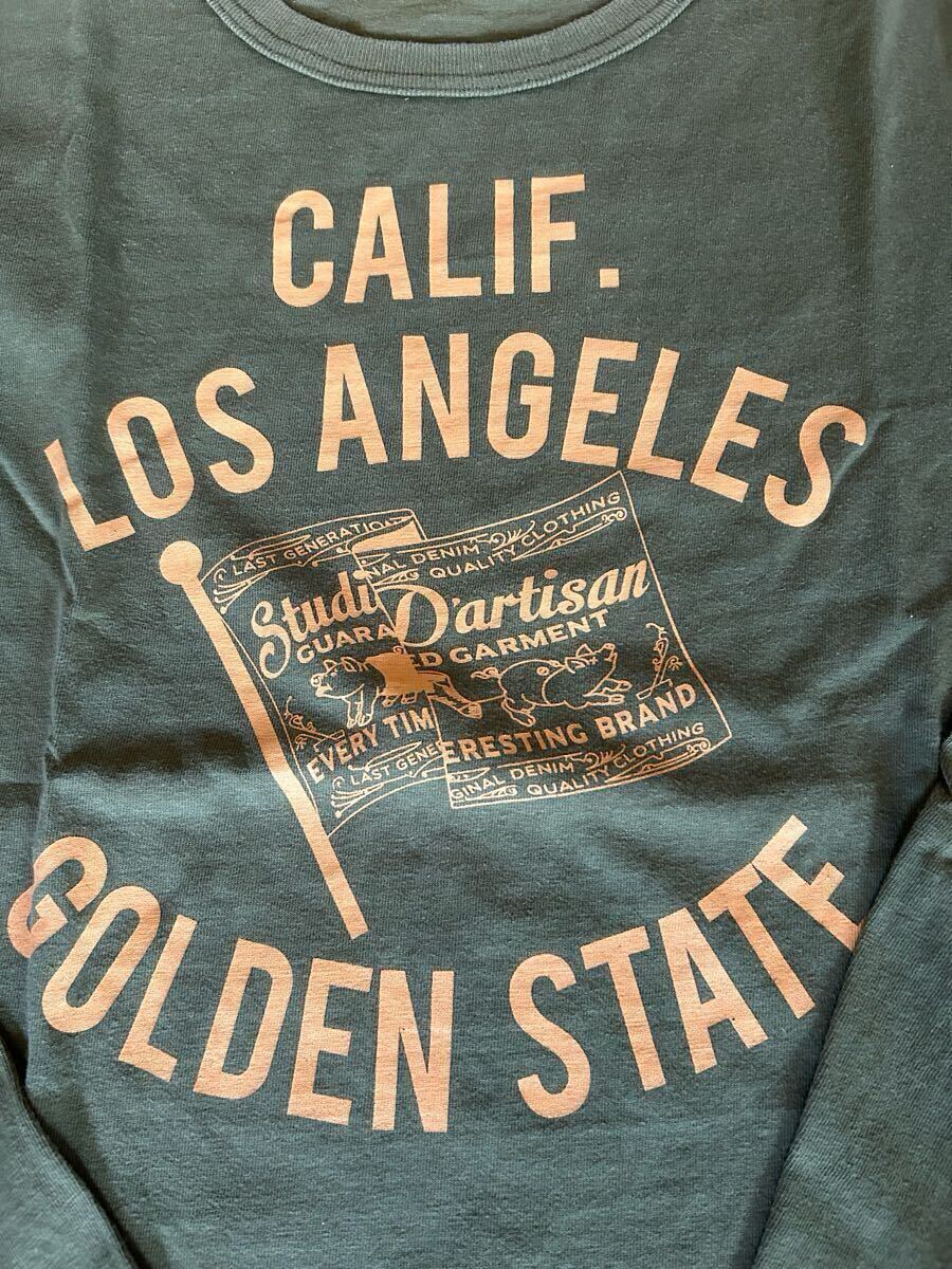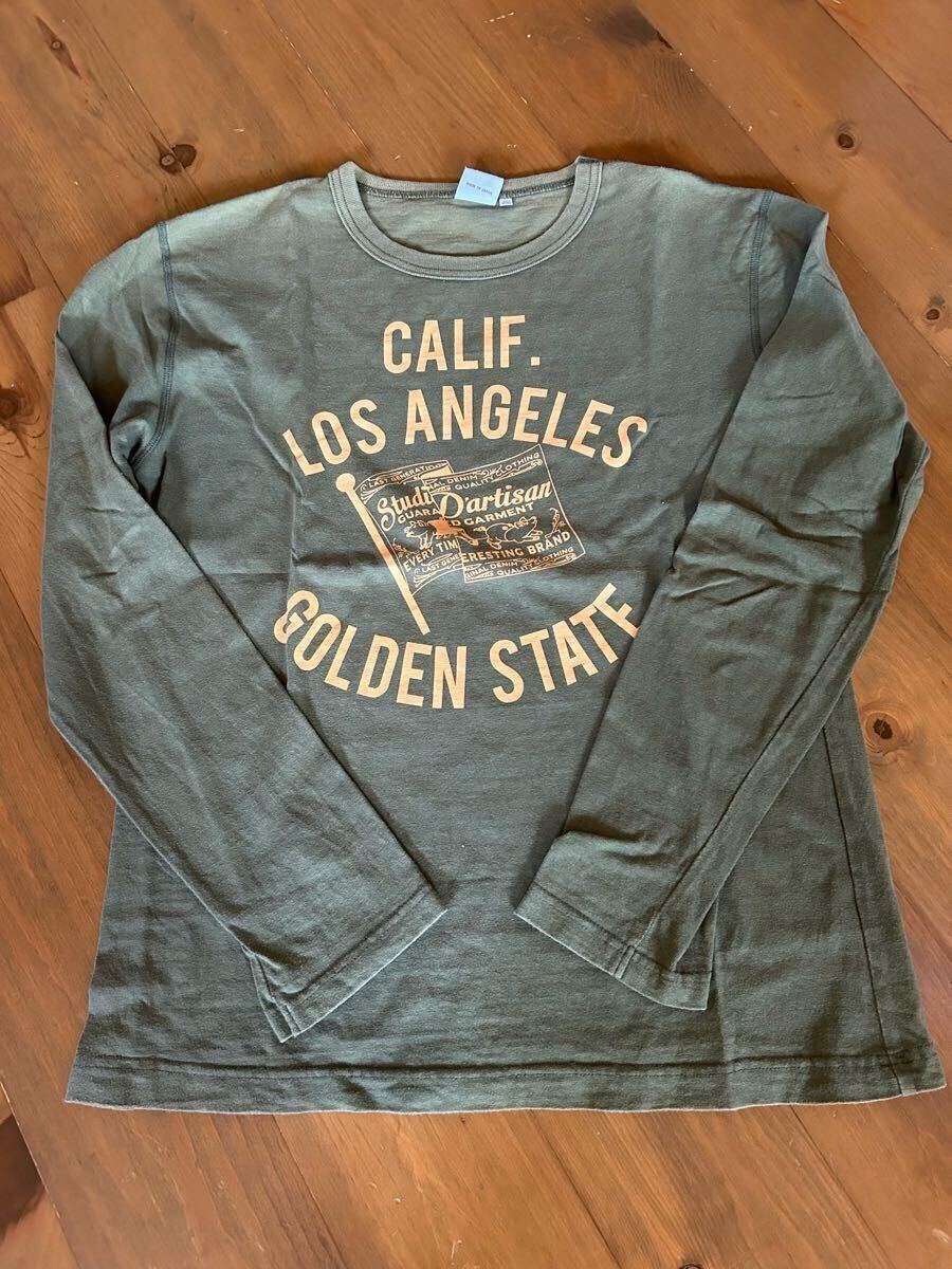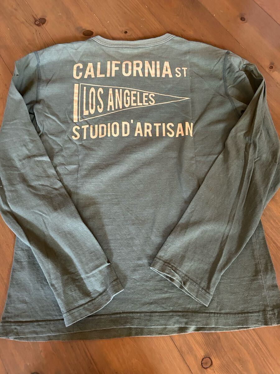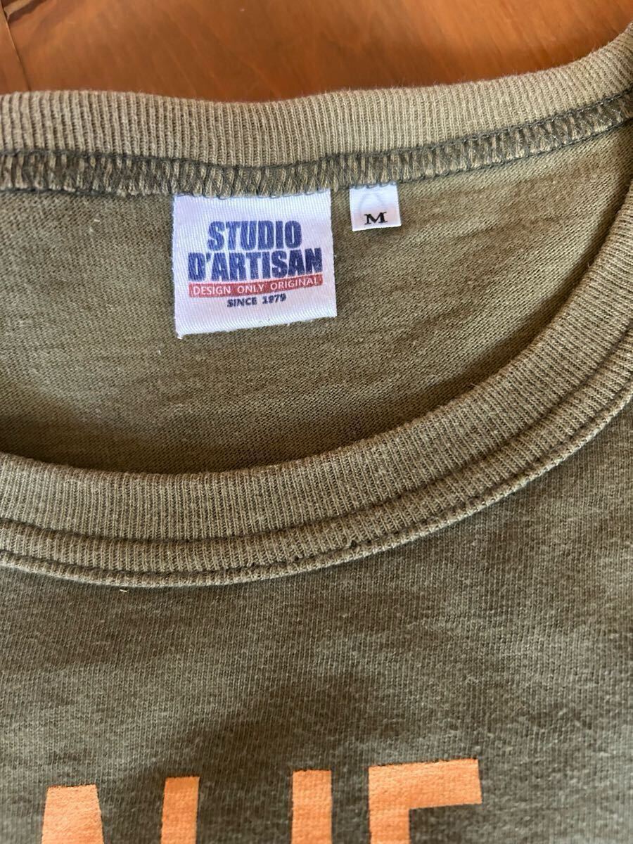スチュディオダルチザンの長袖Tシャツです。サイズはMと表記されており、肩幅約46センチバスト約50センチ着丈約63センチ袖丈約61センチです。素材は綿100%で日本製です。毛羽立ち感や着用感はございますが、まだまだ着ていただけると思います。ノークレーム・ノーリターンでお願い致します。