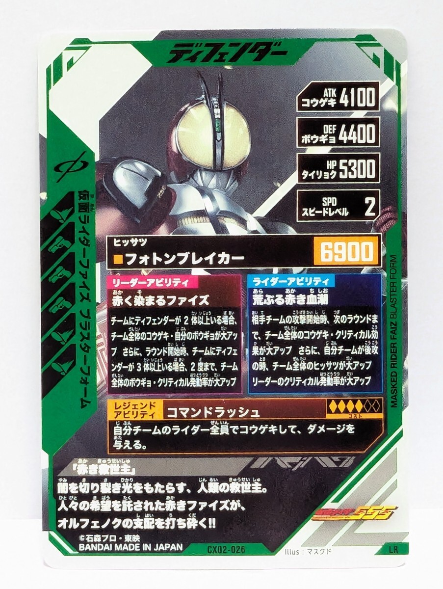 「仮面ライダーバトル ガンバレジェンズCX2弾 仮面ライダーファイズ ブラスターフォーム(LR CX02-026)」を出品します。「おまとめ」可能な方は4枚までミニレター送料85円でお取扱いできます。5枚以上の場合は定形郵便で送料別途計算となります。