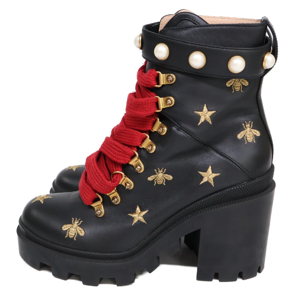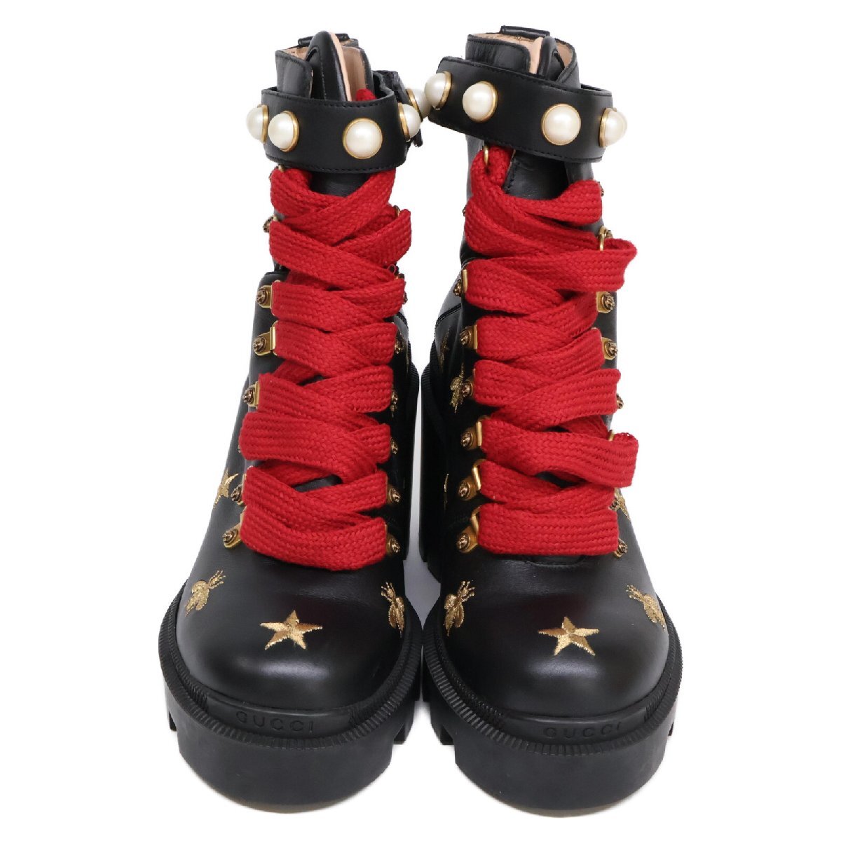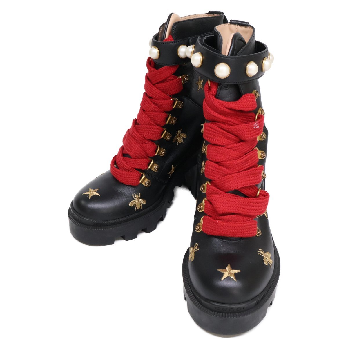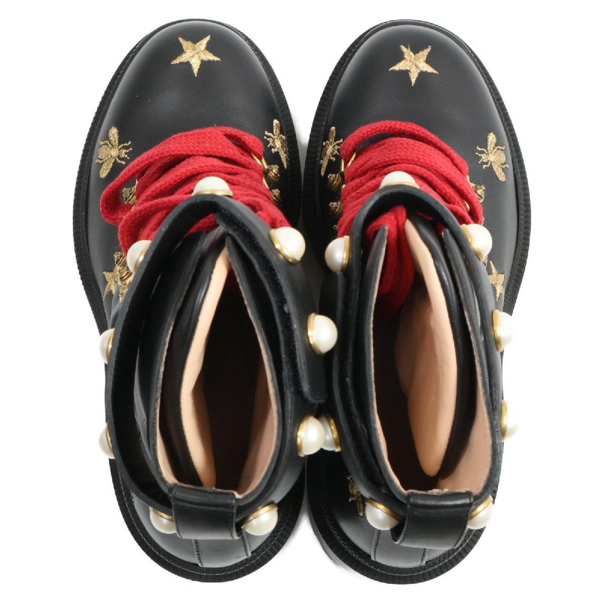 美品 GUCCI グッチ 498695 スター/ビー エンブロイダリー イミテーションパール レザー レースアップ ブーツ シューズ 37 1/2