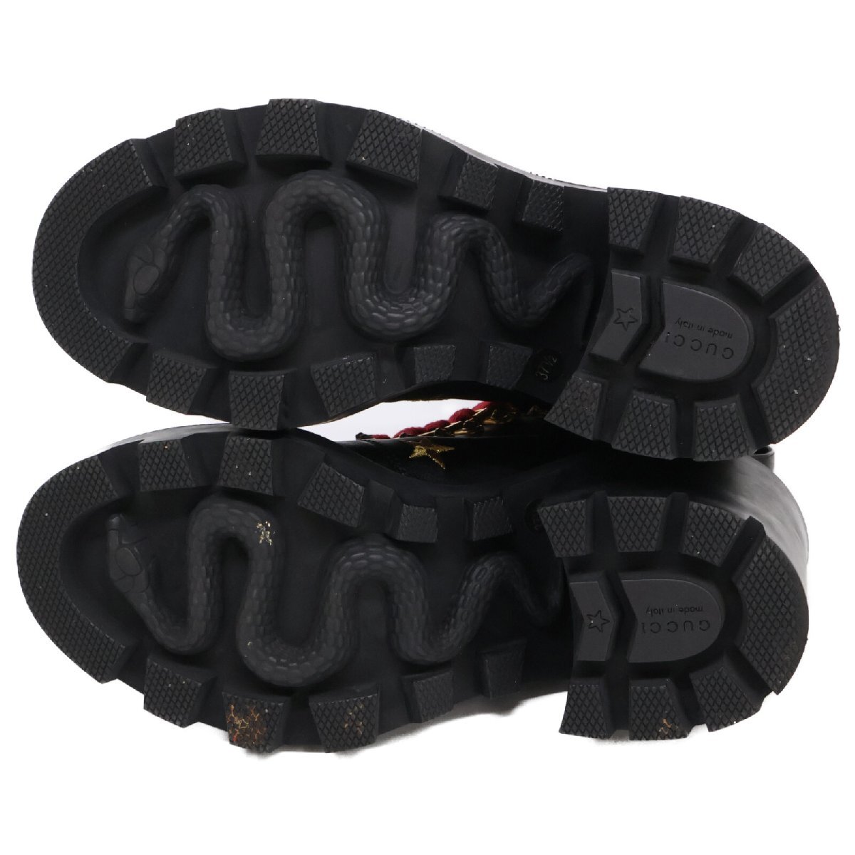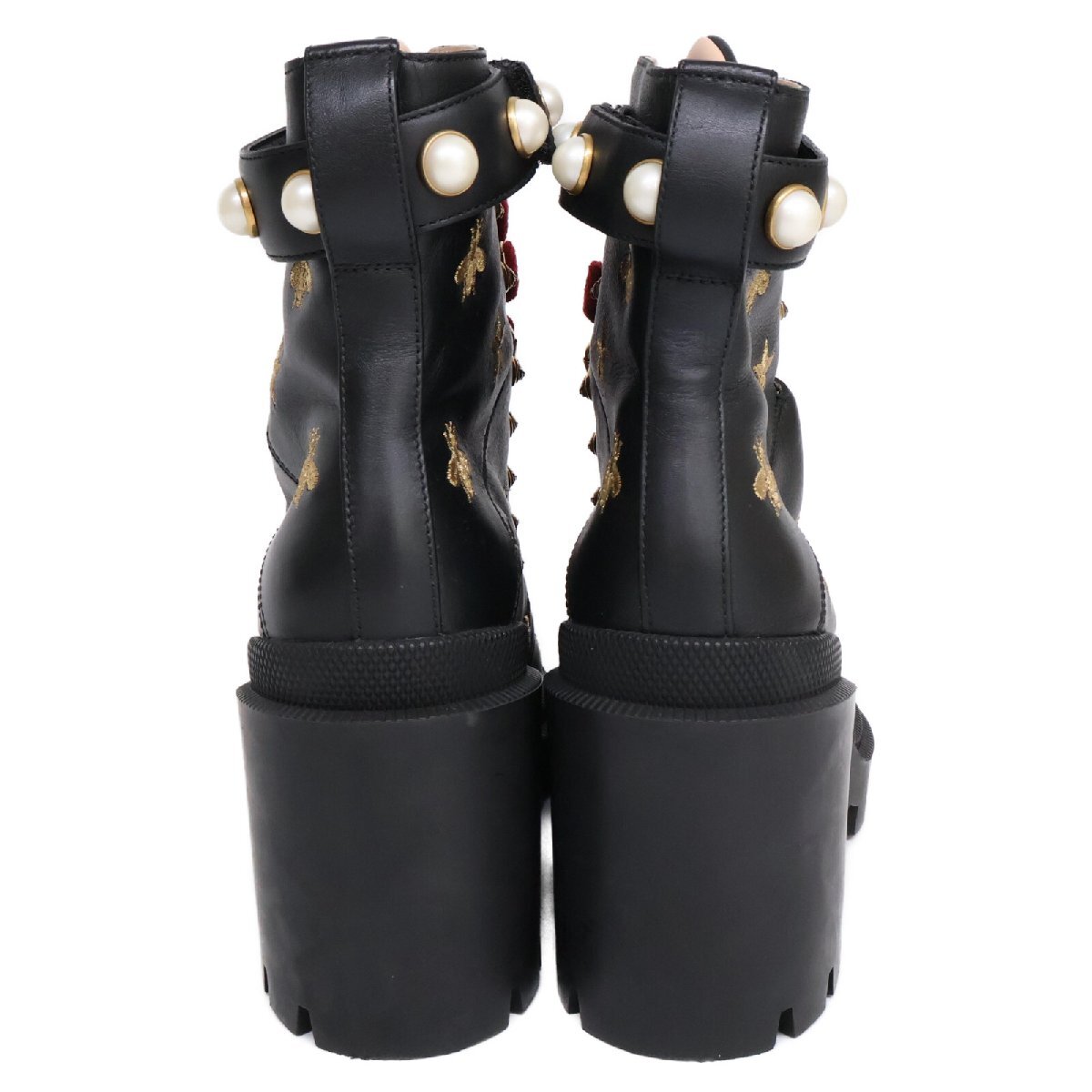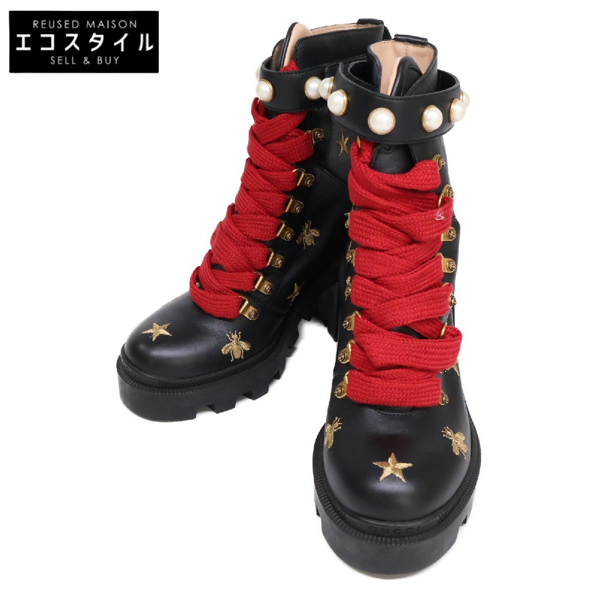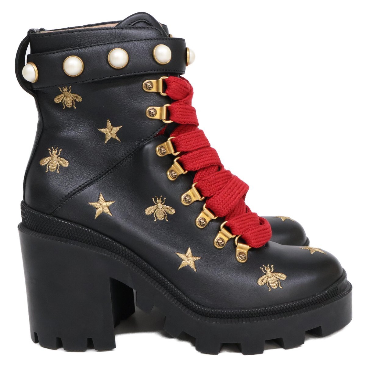 美品 GUCCI グッチ 498695 スター/ビー エンブロイダリー イミテーションパール レザー レースアップ ブーツ シューズ 37 1/2