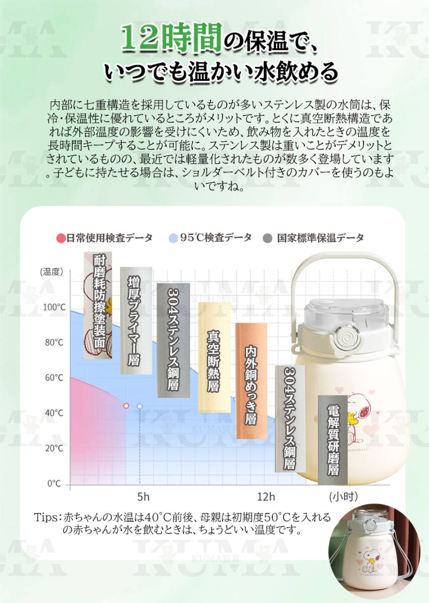 【12時間の保温で、いつでも温かい水飲める】内部に七重構造を採用しているものが多いステンレス製の水筒は、保冷・保温性に優れているところがメリットです。とくに真空断熱構造であれば外部温度の影響を受けにくいため、飲み物を入れたときの温度を長時間キープすることが可能に。ステンレス製は重いことがデメリットとされているものの、最近では軽量化されたものが数多く登場しています。子どもに持たせる場合は、ショルダーベルト付きのカバーを使うのもよいですね。m<br>