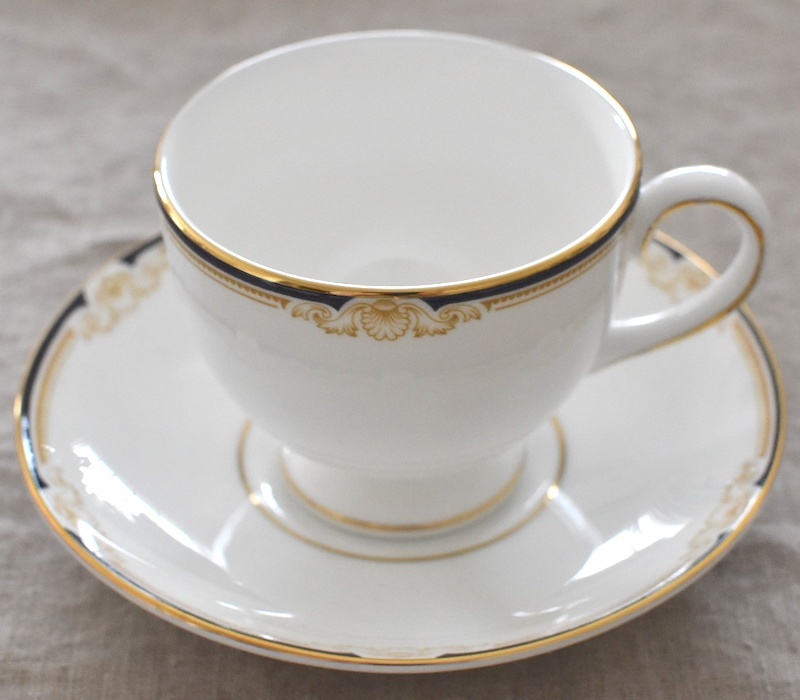 ウェッジウッド Cavendish リー カップ&ソーサー。濃紺のラインと貝殻をモチーフにした曲線を組み合わせたとてもシンプルなボーダー柄で、トラディショナルな中に控えめな優雅さの漂うシリーズです。飽きることなく長く愛用いただけるデザインになっています。