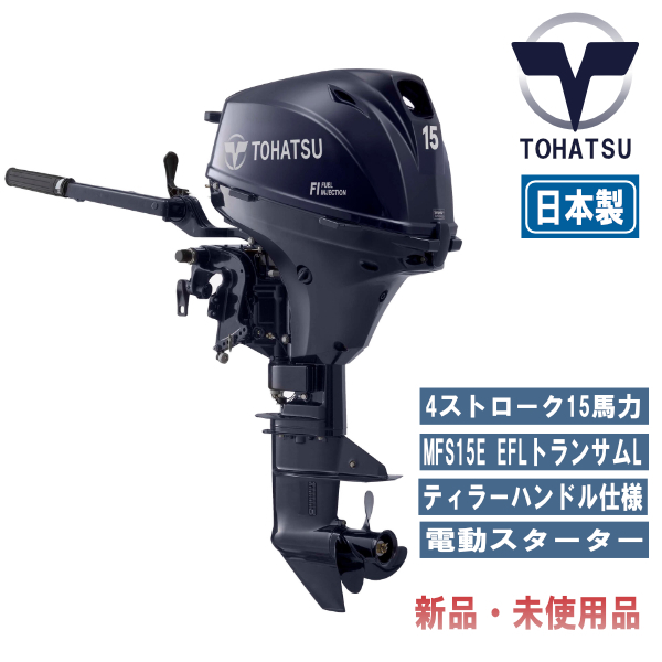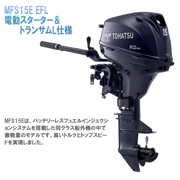 【MFS15E EFL】エンジン形式 4ストローク 2気筒 フューエルインジェクション最大出力 11 Kw(15 PS)排気量 333 ccボア × ストローク 61mm x 57mm始動方法 エレクトリックスタータ(エレクトリックスタータモデル)操作方法 ティラーハンドルギアシフト 前進-中立-後進ギヤ比(減速比) 13:28プロペラ設定範囲 6” - 11.5”トランサム高さ L:562mm燃料種類 無鉛レギュラーガソリンエンジンオイル 純正4ストロークエンジンオイルもしくは API分類 SH,SJ,SL,SM級 SAE 10W-30/40エンジンオイル量 1,000 ml(フィルタ交換時 1,200 ml)燃料タンク 12 L充電能力 12 V - 145 W (12A)全開使用回転範囲 5,400 - 6,100 r/min