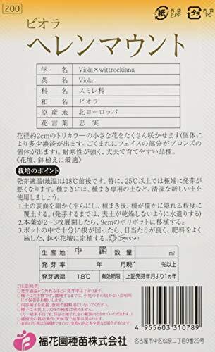・ 310789・『ビオラ・ヘレンマウント』の種子が入っています。・花径約2cmのトリカラ―の小さな花をたくさん咲かせます。・花色に個体により多少濃淡が出ます。また、ごくまれにフェイスの部分がブロンズの個体が出ます 。・耐寒性が強く、丈夫で育てやすい品種です。・播き時:8~10月(発芽適温18℃)【育て方】発芽適温(地温)は18℃前後です。特に、25℃以上では極端に発芽が悪くなります。種まきには、種まき専用の土など、清潔な新しい土を使用しましょう。1. 土の表面を細かく平らにし、種まき後、種が僅かに隠れる程度に覆土する。(発芽するまでは、表土が乾燥しないように水遣りする)2. 本葉が2~3枚展開したら、9cmのポリポット等に移植する。3. ポットの中で十分に根が回ったら、日当たりが良く、肥料をよく施した、鉢や花壇に定植する。ご注意(免責)予めご了承の上、お買い求めください。〇発芽適温から外れるほどに発芽率は下がります。〇種子は生き物です。播種するまでは、直射日光を避け冷暗所にて保管をお願いします。〇内容種子を直接、食用や飼料用にしないでください。〇小児の手の届かないところに保管ください。〇種子は本質上100%の純度は望めません。〇播種後の栽培条件・天候等で結果は異なります。〇表面の写真は印刷物ですので、実際の色と多少異なる場合があります。