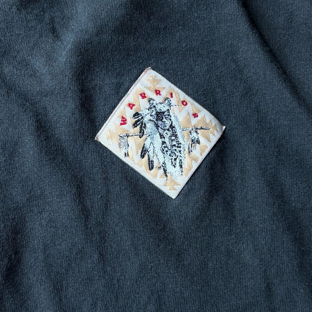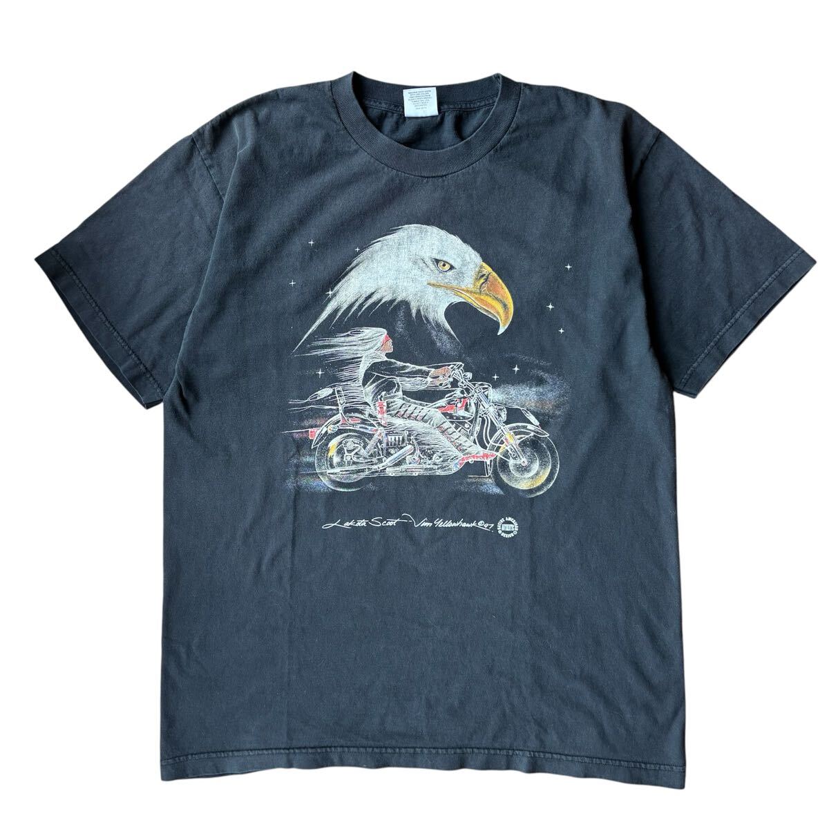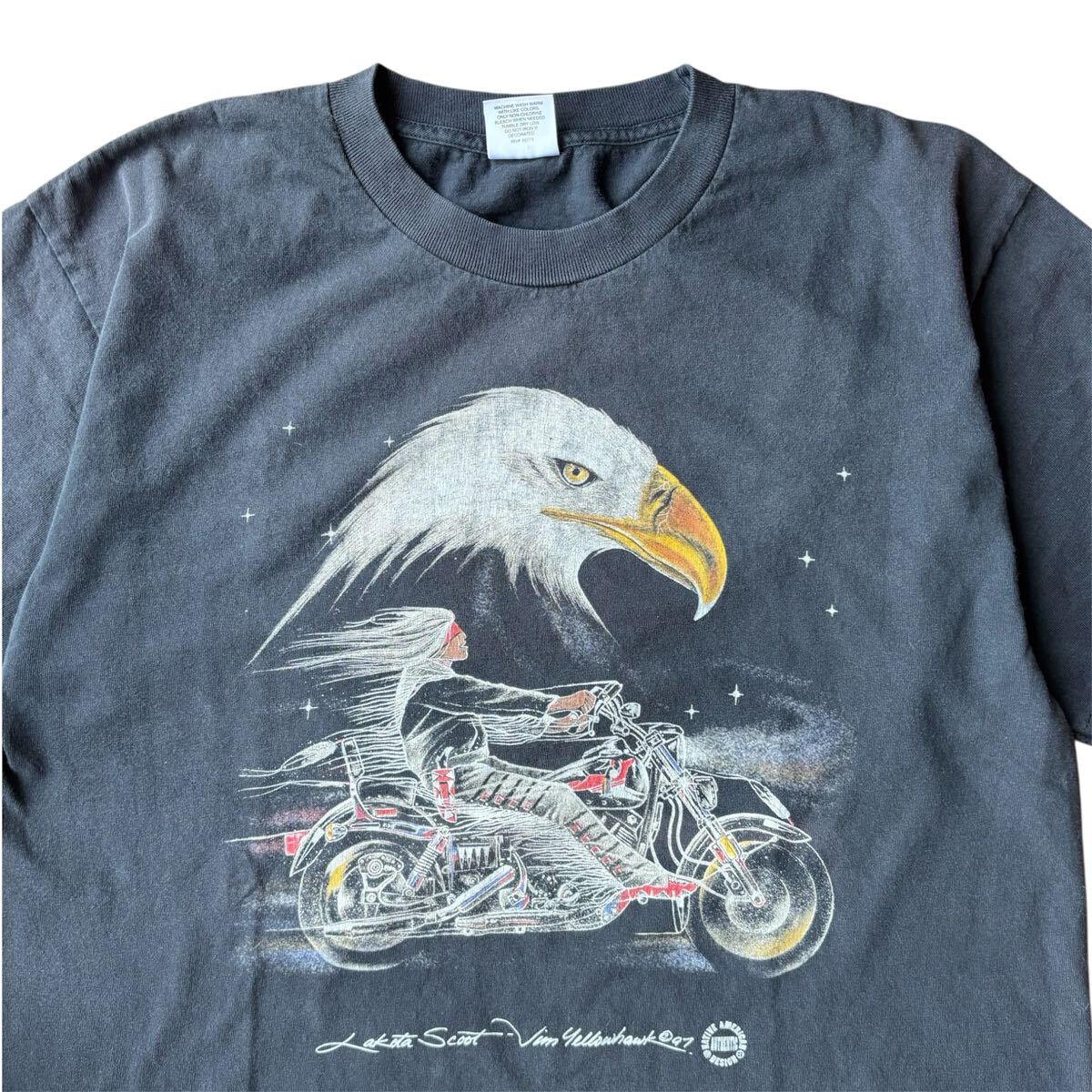 フロントにショベルに跨るネイティブアメリカンのバイカーとその背景にイーグルが描かれたこの年代のバイカー感溢れる1枚。