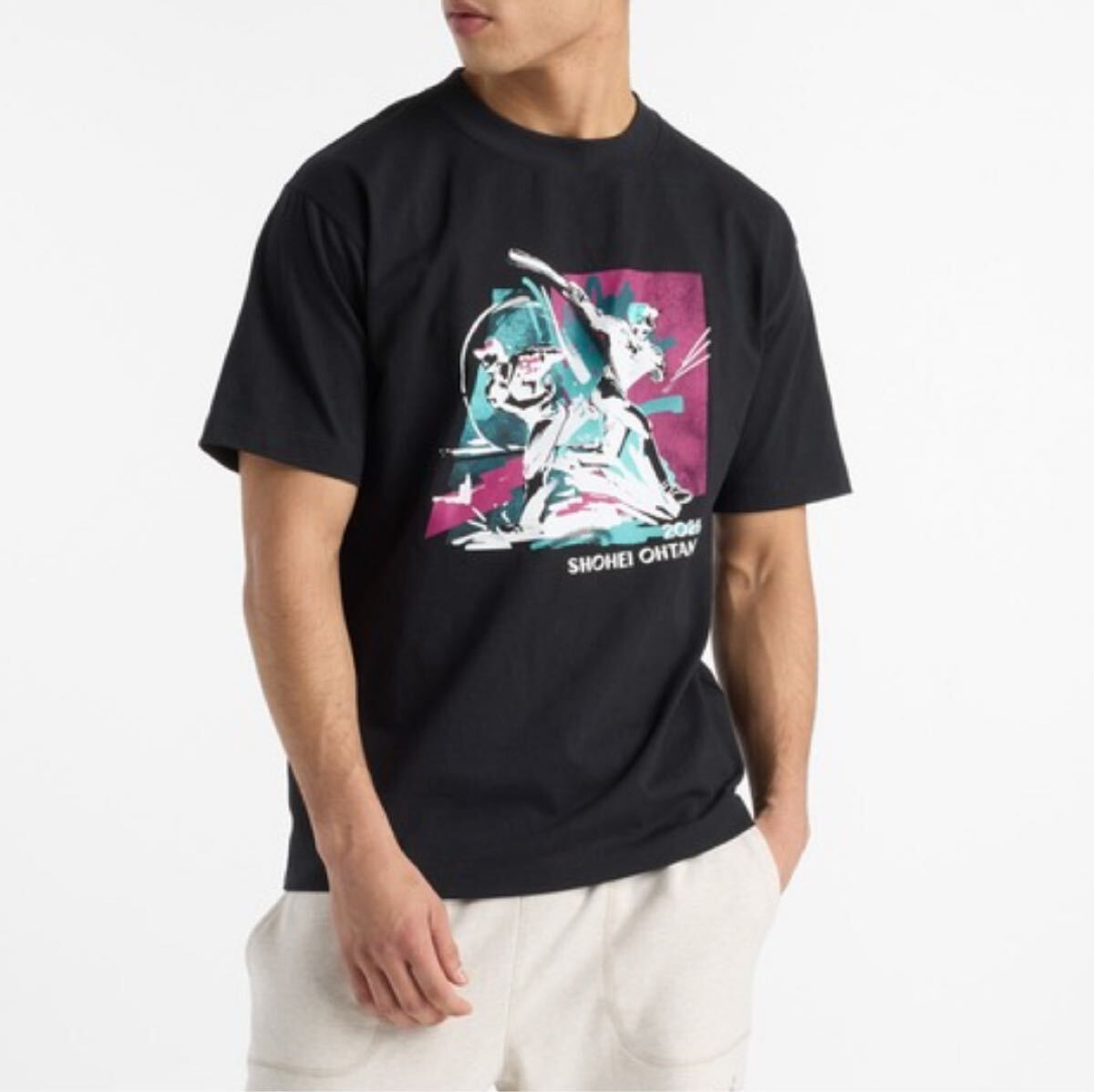 Shohei Ohtani Two Swords T シャツは、一日中快適に過ごせるよう、ゆったりとしたフィット感の柔らかい 100% コットン素材で作られています。投手と打者の両方としての Ohtani の能力にインスパイアされたグラフィック プリントが中央前面に施されています。