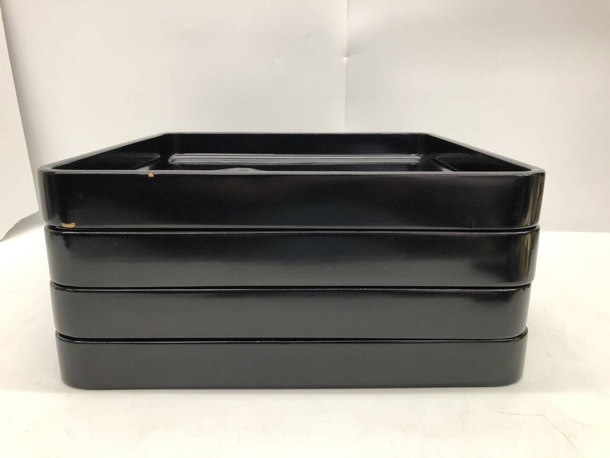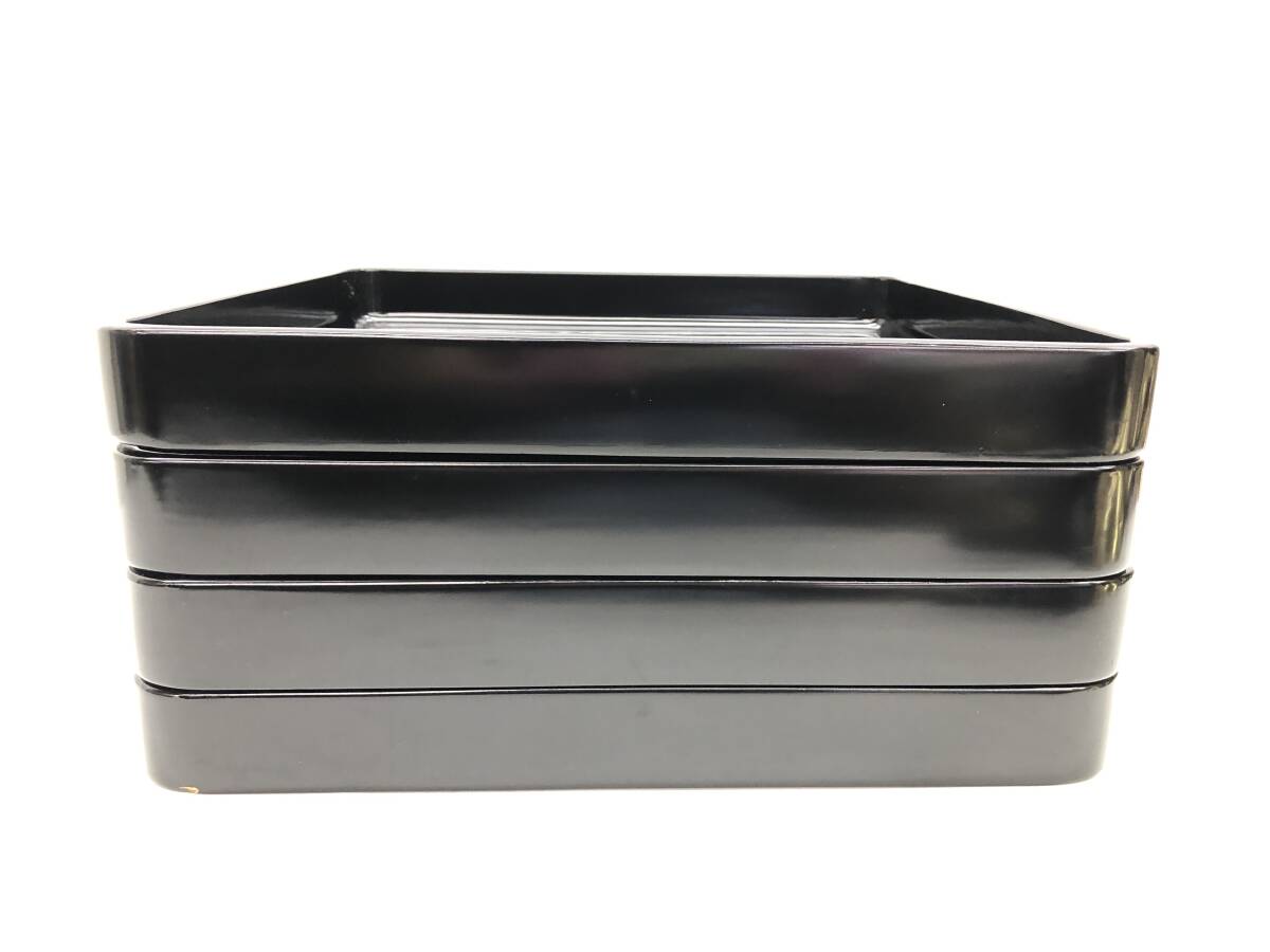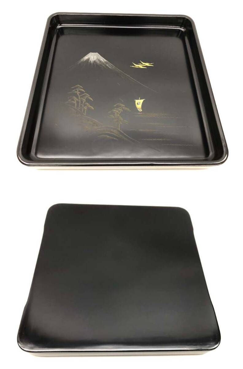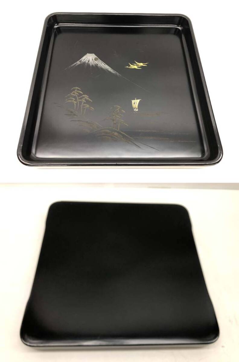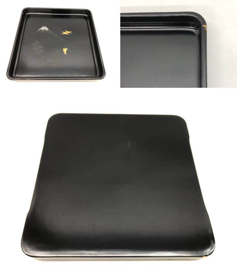 | 旧家蔵出 貝野春松作 美術漆器 堅牢 会席膳 黒塗 沈金 富士に双鶴 吉祥画 4点おまとめ 角盆 敷盆 和食器 天然木 漆器 漆塗 36×36×4㎝ ② |
