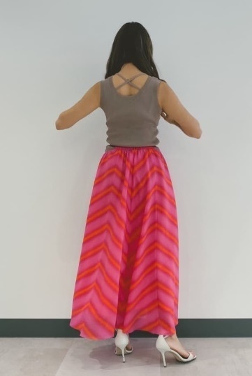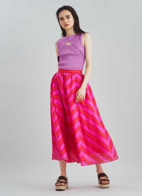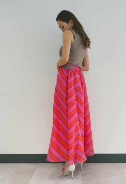 主観では注意深く見ないとわからないレベルだと思いますが気になる方は入札をご遠慮ください。 落ち感のある薄手の涼しげな素材です。ウエストのカットアウトがアクセントになっています。