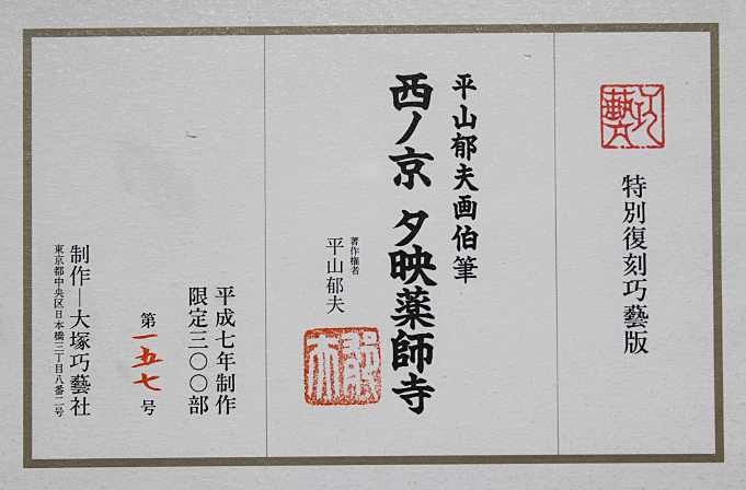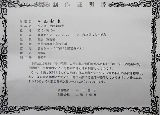 ■☆平山郁夫 【西ノ京 夕映薬師寺】 特別復刻巧藝版 大塚巧藝 1995年 工芸画 エディション有り 証明書有り