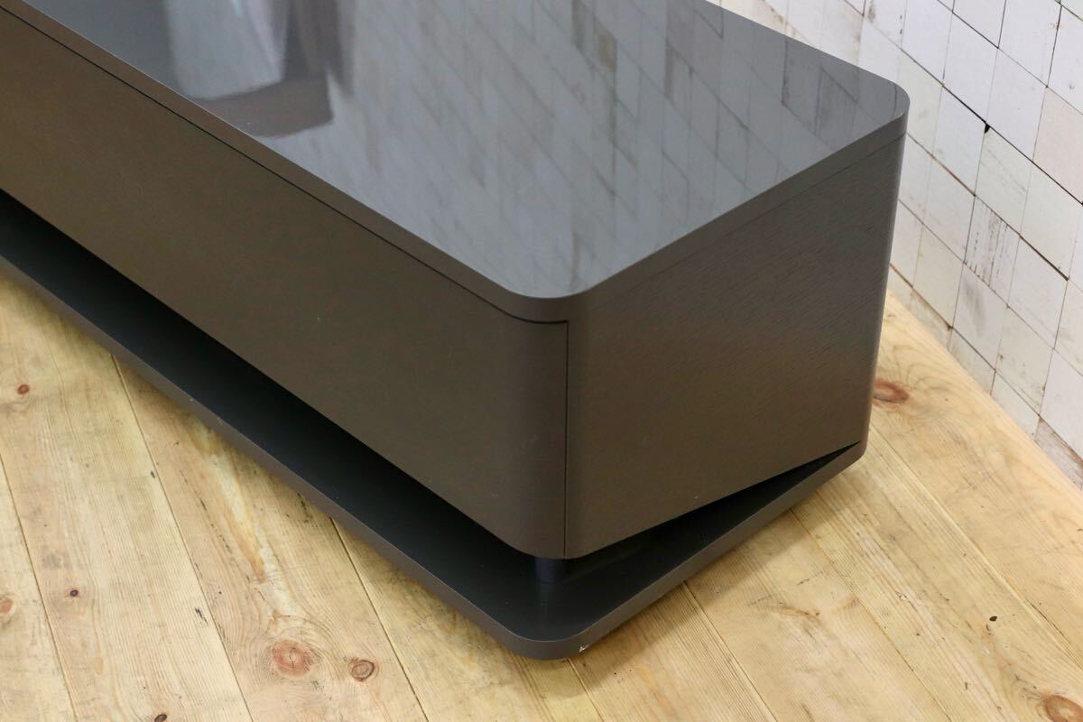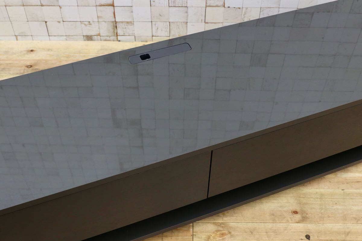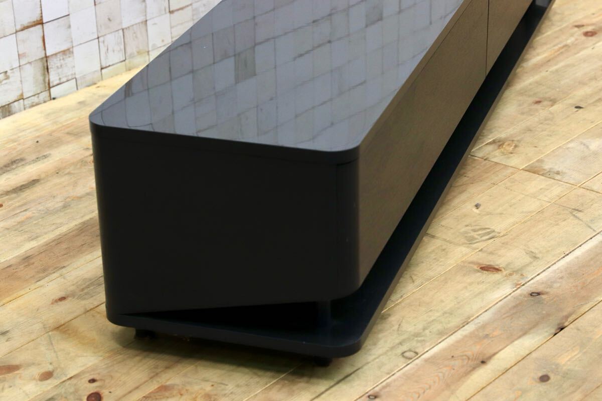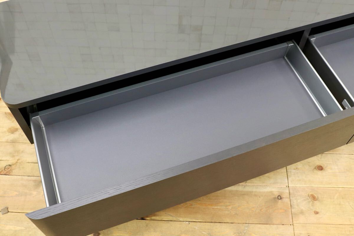 正面から奥へと流れるような wedge(楔形)が象徴的な美しいフォルム。あらゆる角度から見ても途切れのないフォルムは、どこから見ても美しく完成度の高いデザインです。柔らかな印象の天然木突板のボディを、無機質で光沢のあるDHラミネートで挟み込むように配置することで、異なる素材同士が互いを惹き立て合うコントラストをお楽しみいただけるテレビボードとなっています。