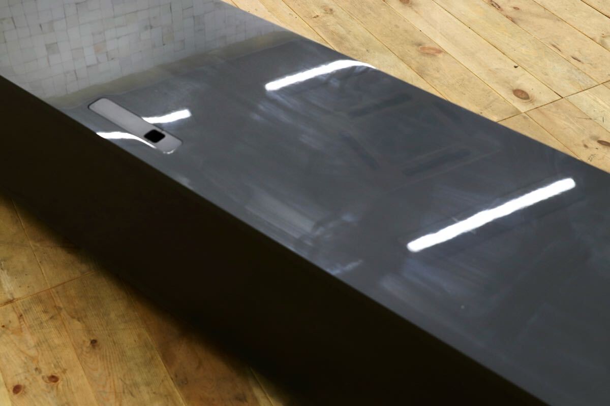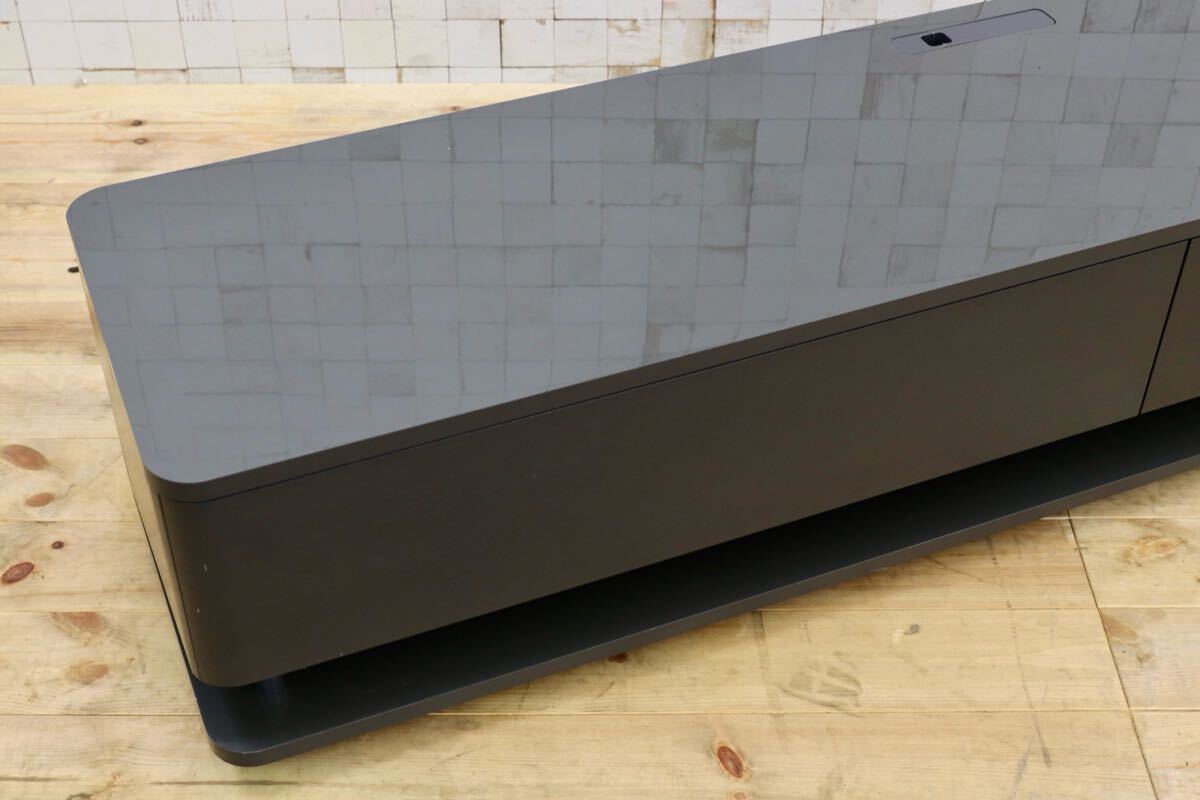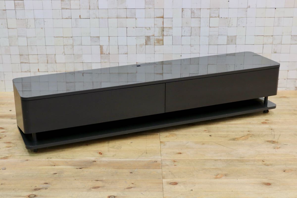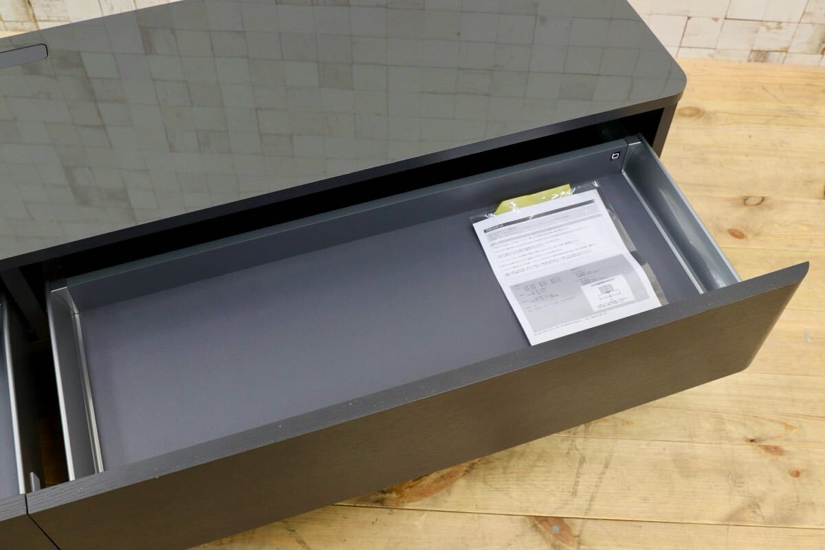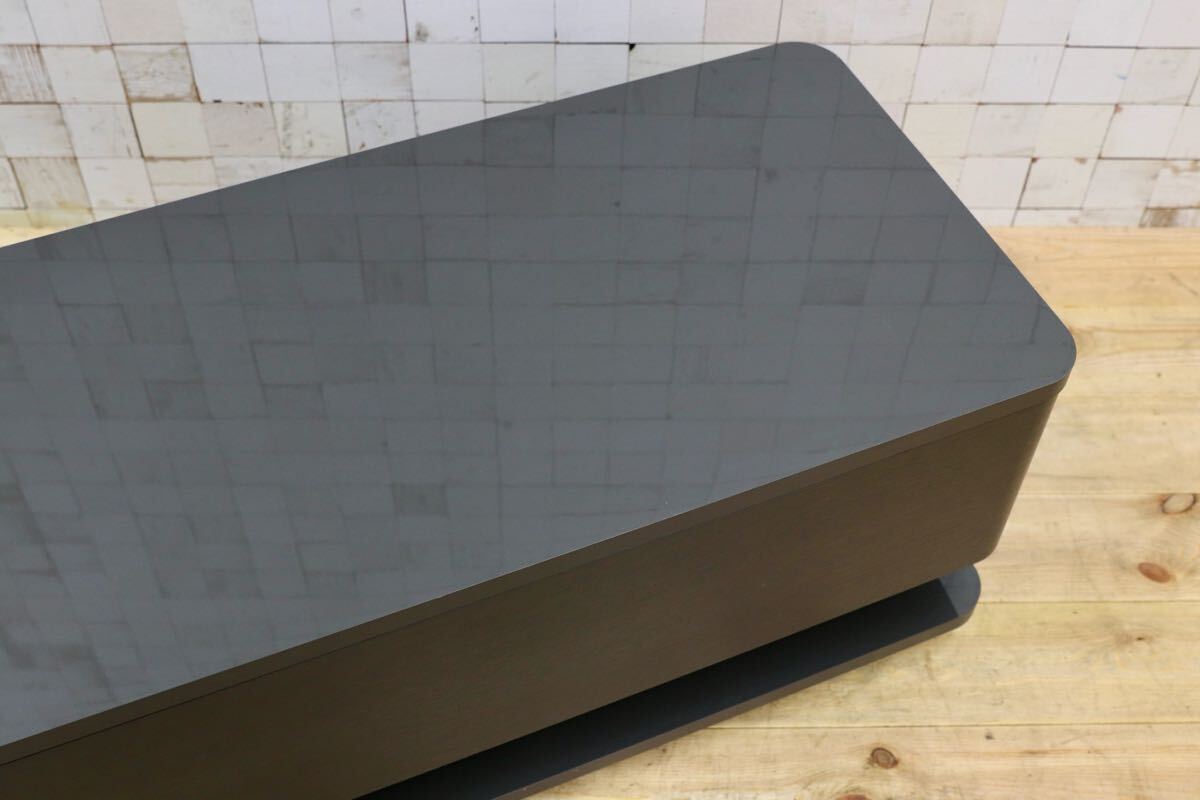 正面から奥へと流れるような wedge(楔形)が象徴的な美しいフォルム。あらゆる角度から見ても途切れのないフォルムは、どこから見ても美しく完成度の高いデザインです。柔らかな印象の天然木突板のボディを、無機質で光沢のあるDHラミネートで挟み込むように配置することで、異なる素材同士が互いを惹き立て合うコントラストをお楽しみいただけるテレビボードとなっています。